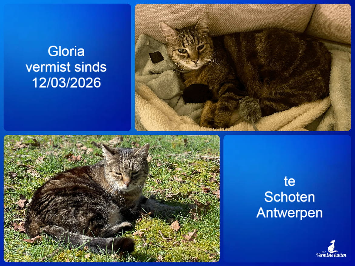 Naam kat: Gloria Datum vermist: 12/03/2026 Plaats verdwijning: Koekoekdreef Woonplaats: Schoten Provincie: Antwerpen Geslacht: Kattin Gesteriliseerd/Gecastreerd: Ja Geboortedatum Kat: 19/05/2012 Chip: Ja Aanvullende kenmerken: Tijgerkat, halsband, 2 chips. Mauwt veel, zoekt menselijke gezelschap en...