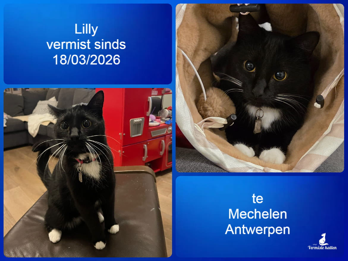 Naam kat: Lilly Datum vermist: 18/03/2026 Plaats verdwijning: Berendansstraat Woonplaats: Mechelen Provincie: Antwerpen Geslacht: Kattin Gesteriliseerd/Gecastreerd: Ja Geboortedatum Kat: 01/05/2024 Chip: Ja Aanvullende kenmerken: Zwarte kattin met witte pootjes en wit vlekje op de...