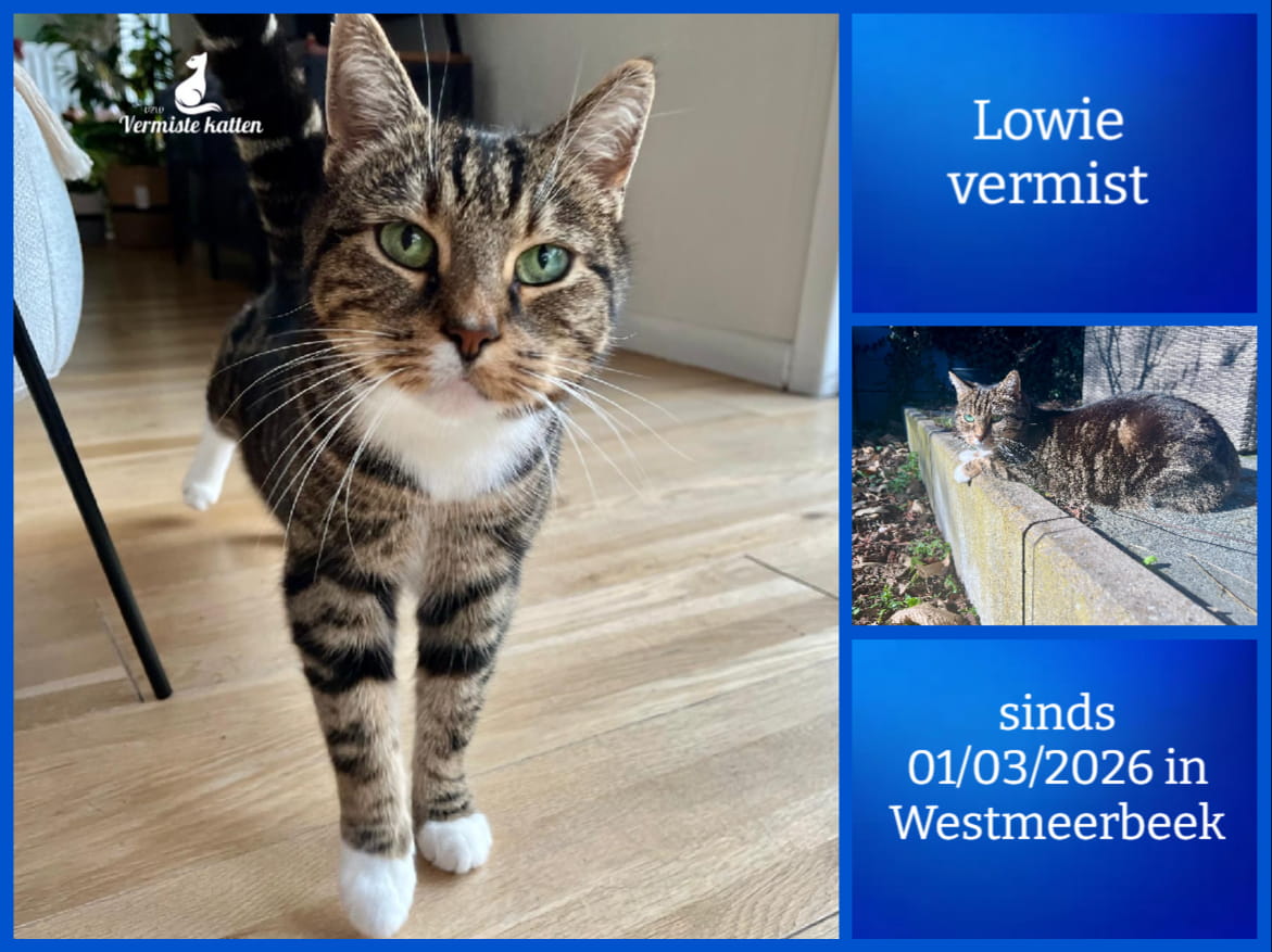 Naam kat: Lowie Datum vermist: 01/03/2026 Plaats verdwijning: Hooivelden Woonplaats: Westmeerbeek Provincie: Antwerpen Geslacht: Kater Gesteriliseerd/Gecastreerd: Ja Geboortedatum Kat: 24/03/2016 Chip: Ja Aanvullende kenmerken: Lowie is een europese korthaar met groene ogen, witte voetjes...