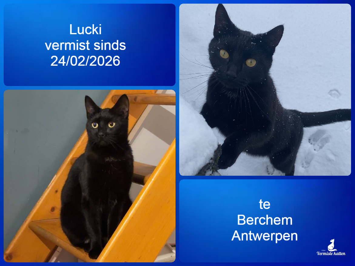 Naam kat: Lucki Datum vermist: 24/02/2026 Plaats verdwijning: Walemstraat Woonplaats: Antwerpen, berchem Provincie: Antwerpen Geslacht: Kater Gesteriliseerd/Gecastreerd: Ja Geboortedatum Kat: 1/10/2024 Chip: Ja Aanvullende kenmerken: Onze zwarte kater is vermist. Hij heeft een volledig...