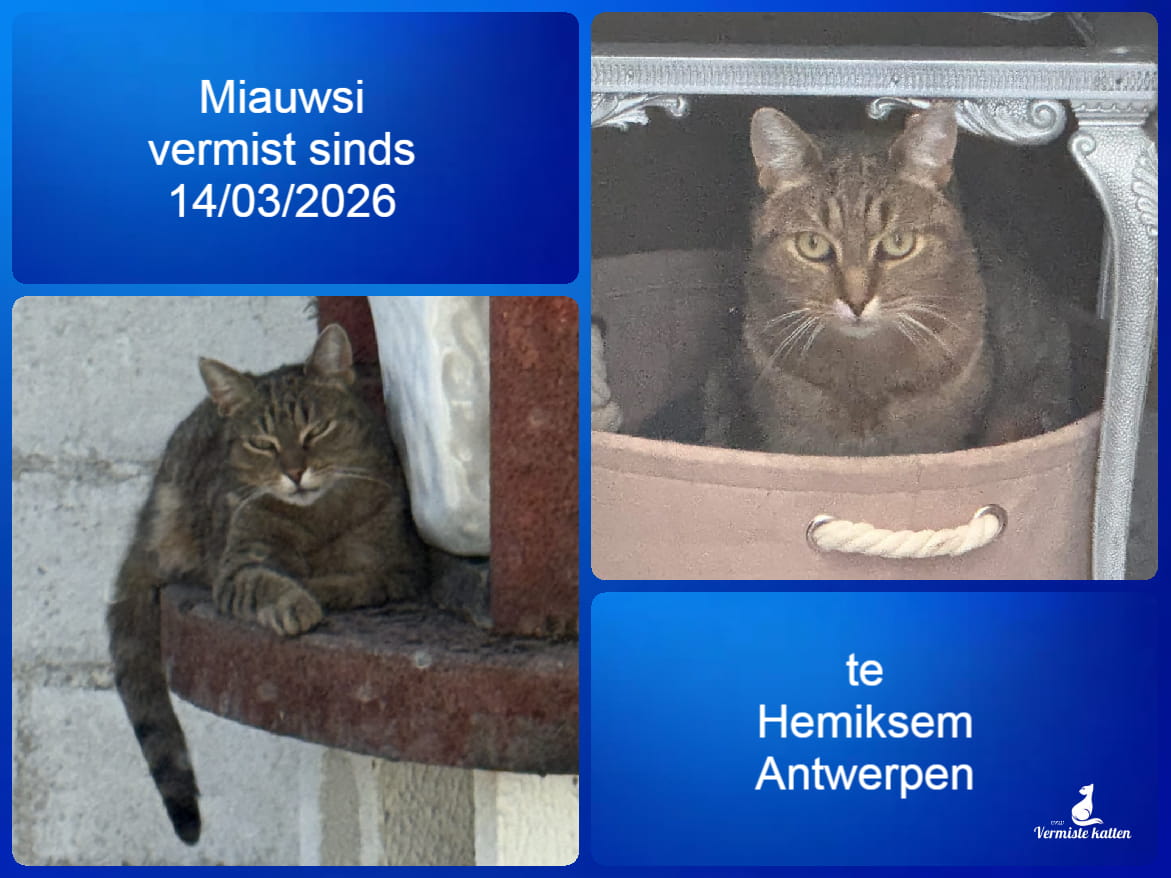 Naam kat: Miauwsi Datum vermist: 14/3/2026 Plaats verdwijning: Saunierlei Woonplaats: Hemiksem Provincie: Antwerpen Geslacht: Kater Gesteriliseerd/Gecastreerd: Ja Geboortedatum Kat: Hij wordt 6 jaar Chip: Ja Aanvullende kenmerken: Hij is gechipt gecastreerd, een wel zeer...