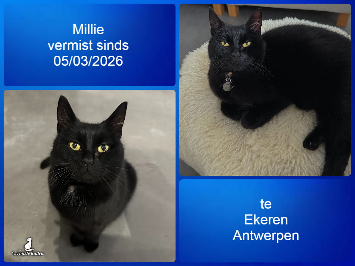 Naam kat: Millie Datum vermist: 05/03/2026 Plaats verdwijning: Veltwijcklaan Woonplaats: Ekeren Provincie: Antwerpen Geslacht: Kattin Gesteriliseerd/Gecastreerd: Ja Geboortedatum Kat: 01/04/2017 Chip: Ja Aanvullende kenmerken: Wit vlekje op de borst, rood halsbandje met zilveren amuletje...