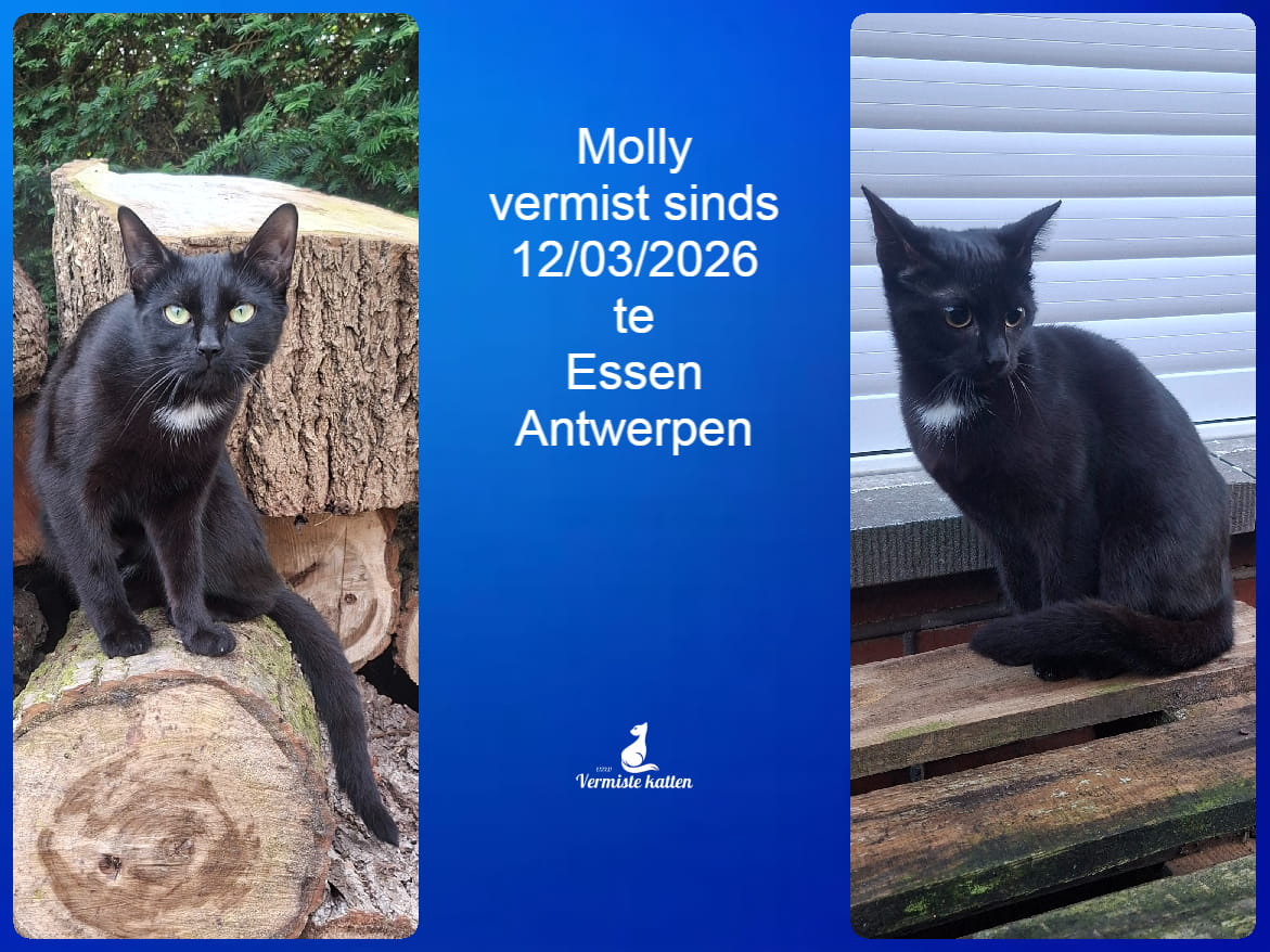Naam kat: Molly Datum vermist: 12/03/2026 Plaats verdwijning: Guido Gezelleaan Woonplaats: Essen Provincie: Antwerpen Geslacht: Kattin Gesteriliseerd/Gecastreerd: Ja Geboortedatum Kat: 23-03-2025 Chip: Ja Aanvullende kenmerken: Zwart met wit vlekje op haar borst Mail: vermistekatten.be@gmail.com...