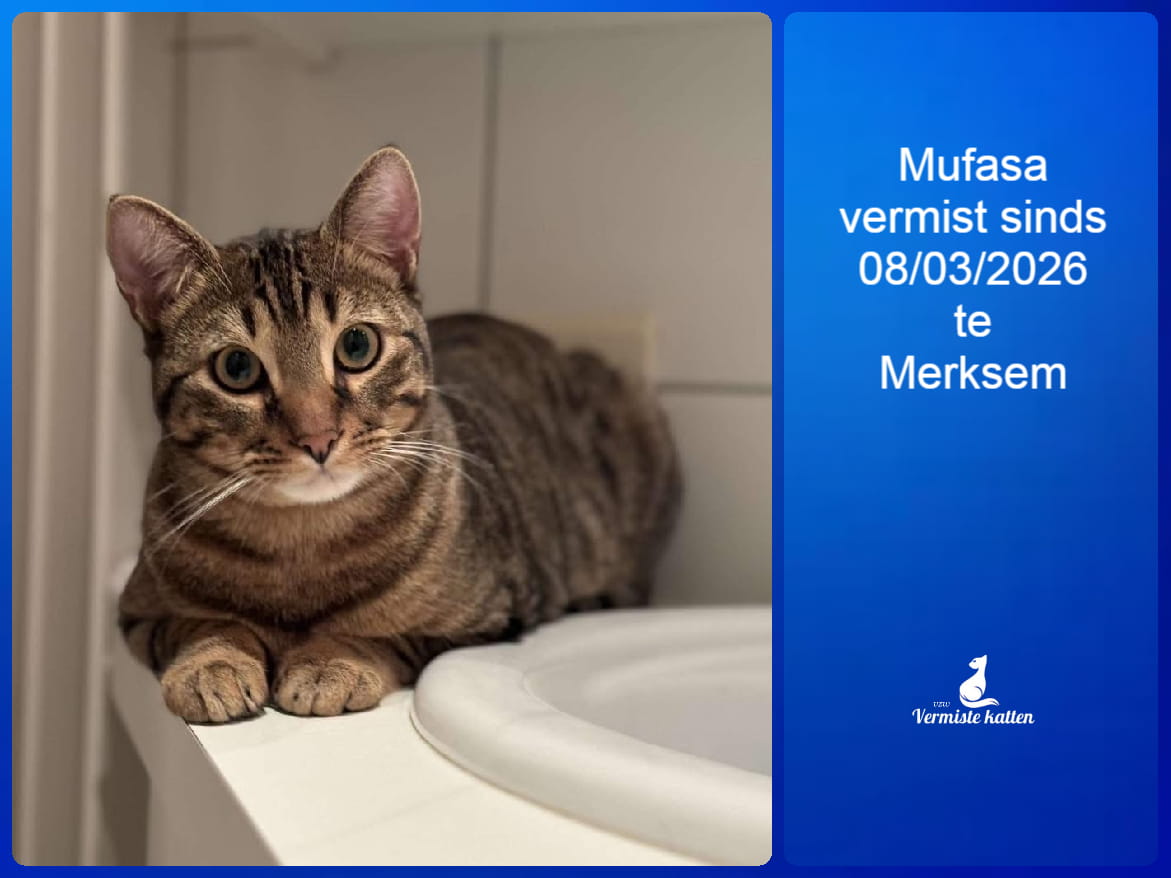 Naam kat: Mufasa Datum vermist: 08/03/2026 Plaats verdwijning: Sint bartholomeusstraat Woonplaats: Merksem Provincie: Antwerpen Geslacht: Kater Gesteriliseerd/Gecastreerd: Ja Geboortedatum Kat: 12/03/2024 Chip: Nee Aanvullende kenmerken: Tijgerkatje van normale grootte, grote ogen van oranjebruinige kleur....