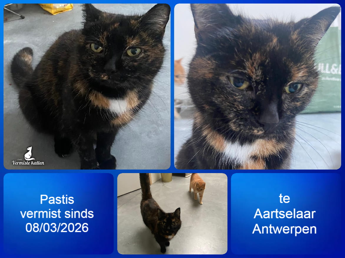 Naam kat: Pastis Datum vermist: 8/3/2026 Plaats verdwijning: John F Kennedylaan Woonplaats: Aartselaar Provincie: Antwerpen Geslacht: Kattin Gesteriliseerd/Gecastreerd: Ja Geboortedatum Kat: 1/1/2014 Chip: Nee Aanvullende kenmerken: Opvallend witte vlek id hals met flink stukje...