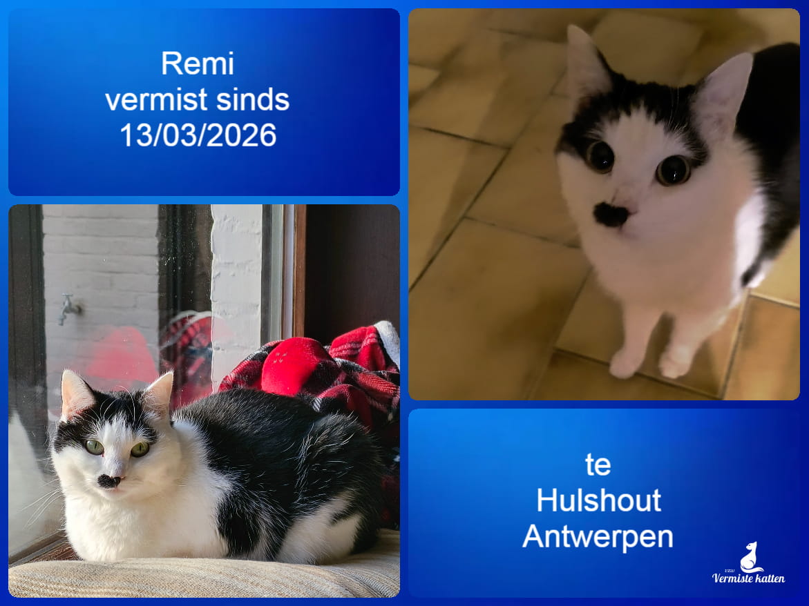 Naam kat: Remi Datum vermist: 13/03/2026 Plaats verdwijning: Grote Baan, Woonplaats: Hulshout Provincie: Antwerpen Geslacht: Kattin Gesteriliseerd/Gecastreerd: Ja Geboortedatum Kat: 5/9/2023 Chip: Ja Aanvullende kenmerken: Zwart-witte Mail: vermistekatten.be@gmail.com...