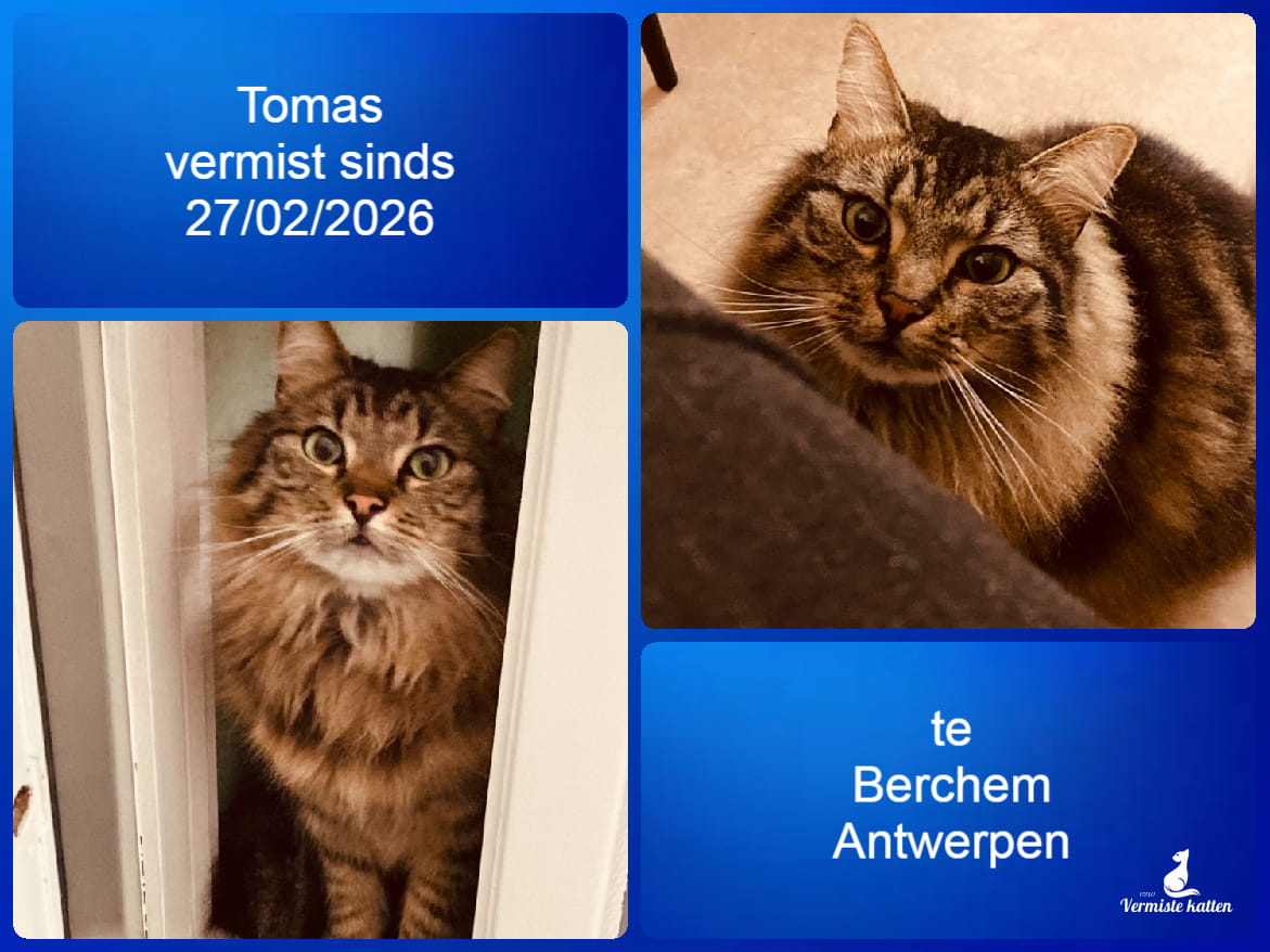 Naam kat: Tomas Datum vermist: 27/2/2026 Plaats verdwijning: Bikschotelaan, Woonplaats: Berchem Provincie: Antwerpen Geslacht: Kater Gesteriliseerd/Gecastreerd: Ja Geboortedatum Kat: 15/4/2022 Chip: Ja Aanvullende kenmerken: Tomas is een halflangharige, bruine tijgerkat. Hij is zeer sociaal....