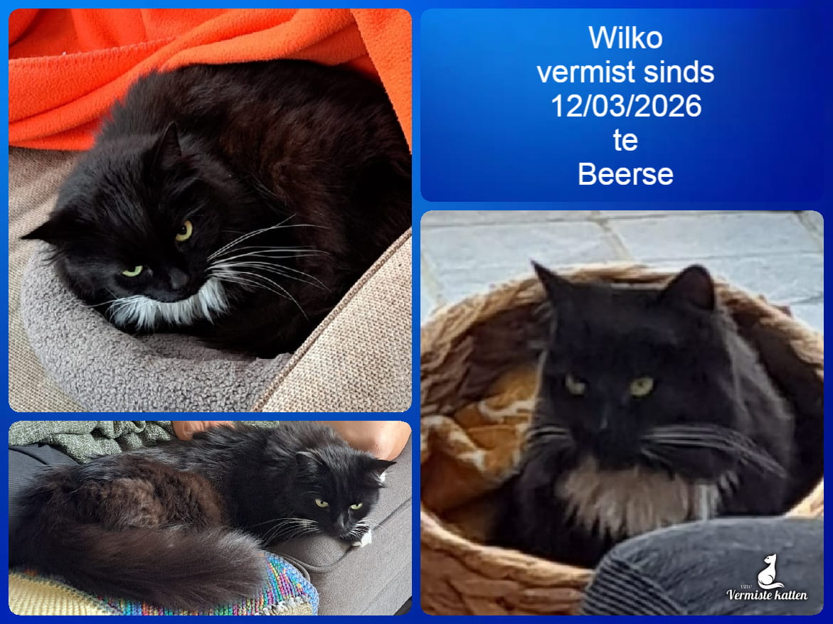Naam kat: Wilko Datum vermist: 12/03/2026 Plaats verdwijning: Eikenstraat, Woonplaats: Beerse Provincie: Antwerpen Geslacht: Kater Gesteriliseerd/Gecastreerd: Ja Geboortedatum Kat: 15/05/2021 Chip: Ja Aanvullende kenmerken: zwarte langharige boerderijkat met witte hals en witte pootjes. Redelijk...