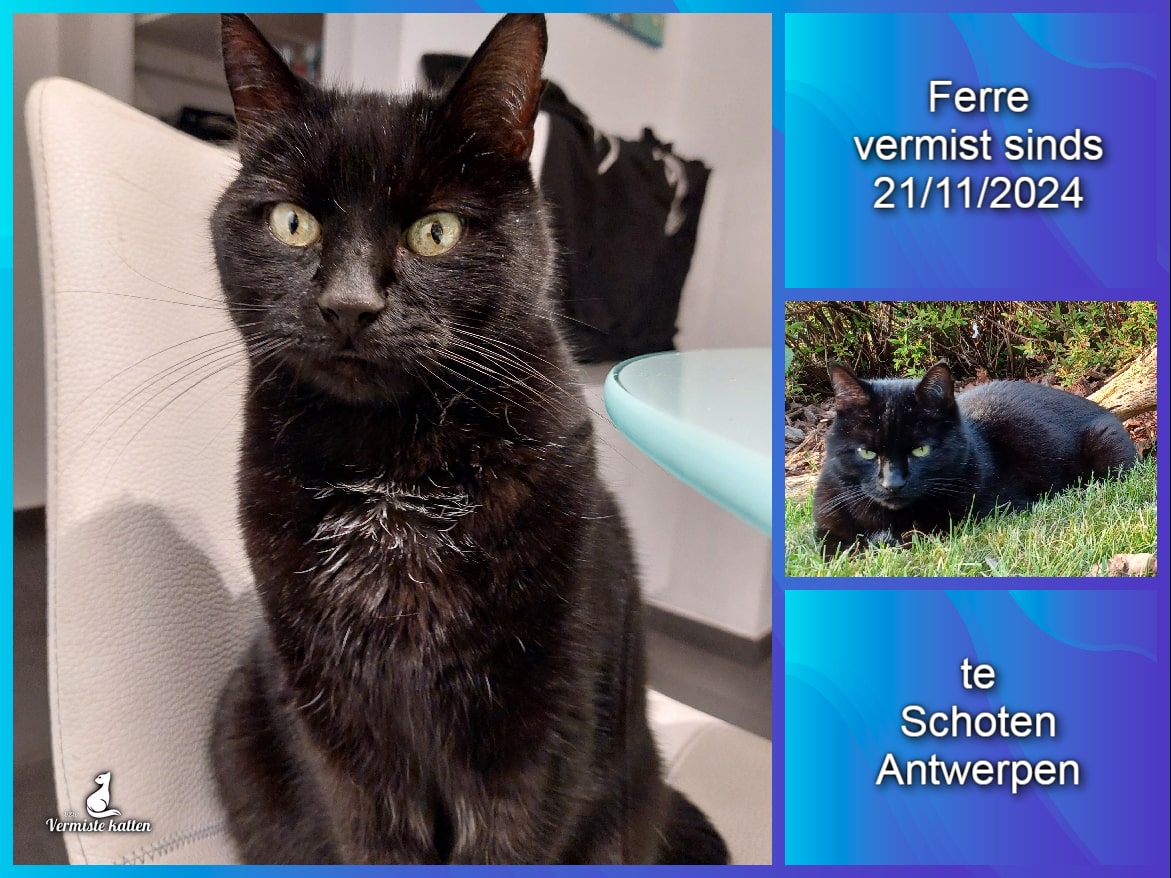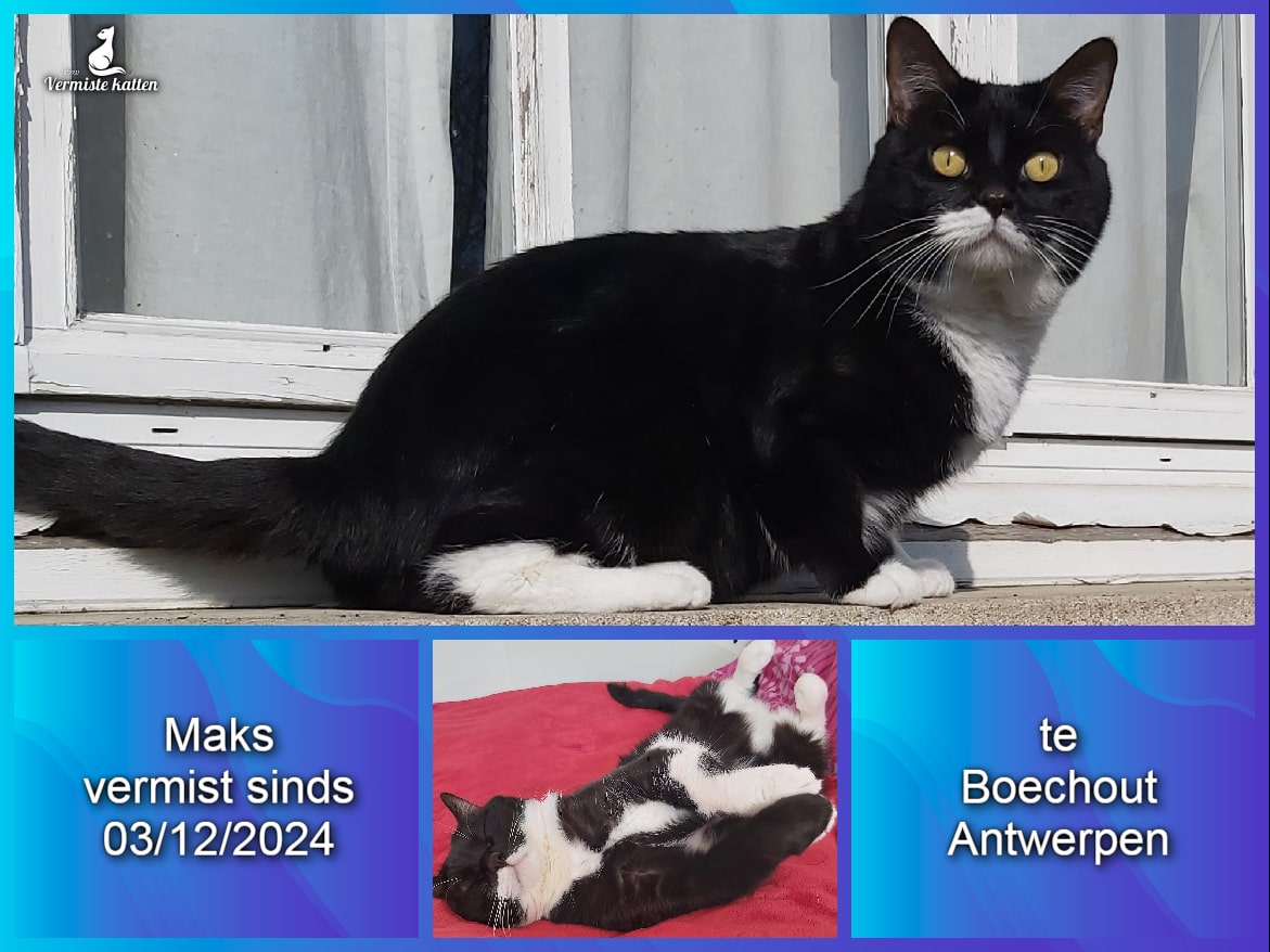 Naam kat: Maks Datum vermist: 3/12/2024 Plaats verdwijning: Onze-Lieve-Vrouweplein, Woonplaats: Boechout Provincie: Antwerpen Geslacht: Kater Gesteriliseerd/Gecastreerd: Nee Geboortedatum Kat: 1/05/2017 Chip: Nee Aanvullende kenmerken: Zwart-wit, heeft huidziekte dus wondjes overal op zijn lichaam Mail: vermistekatten.be@gmail.com...