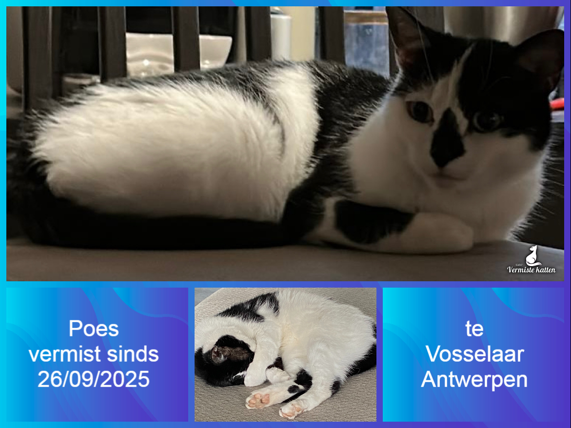Naam kat: Poes Datum vermist: 26/09/2025 Plaats verdwijning: Oudebaan Woonplaats: Vosselaar Provincie: Antwerpen Geslacht: Kattin Gesteriliseerd/Gecastreerd: Ja Geboortedatum Kat: 01/05/2016 Chip: Ja Aanvullende kenmerken: Zwart-wit. Kleine, redelijk angstige kat Mail: vermistekatten.be@gmail.com...