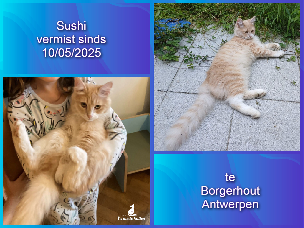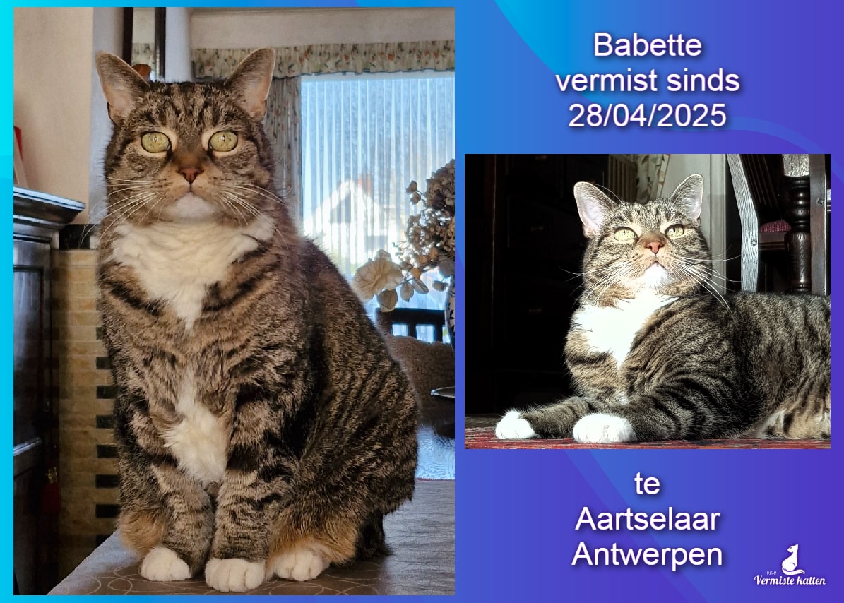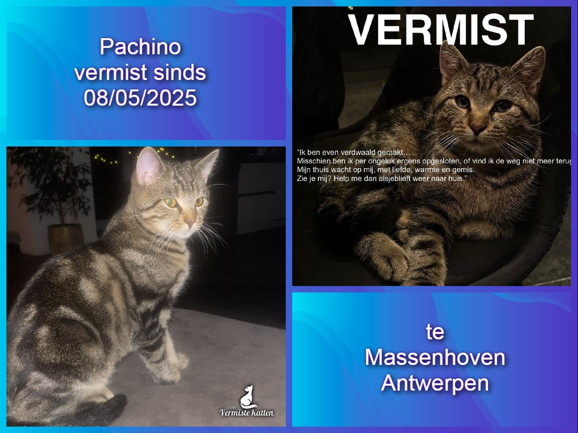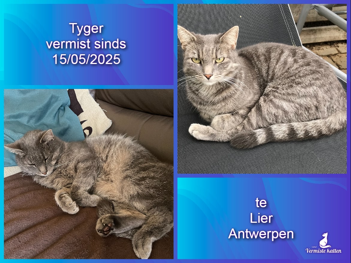 Naam kat: Tyger Datum vermist: 15-05-2025 Plaats verdwijning: Frankenweg Woonplaats: Lier Provincie: Antwerpen Geslacht: Kater Gesteriliseerd/Gecastreerd: Ja Geboortedatum Kat: 4-5-2017 Chip: Ja Aanvullende kenmerken: Muisgrijze tijgerprint Mail: vermistekatten.be@gmail.com...