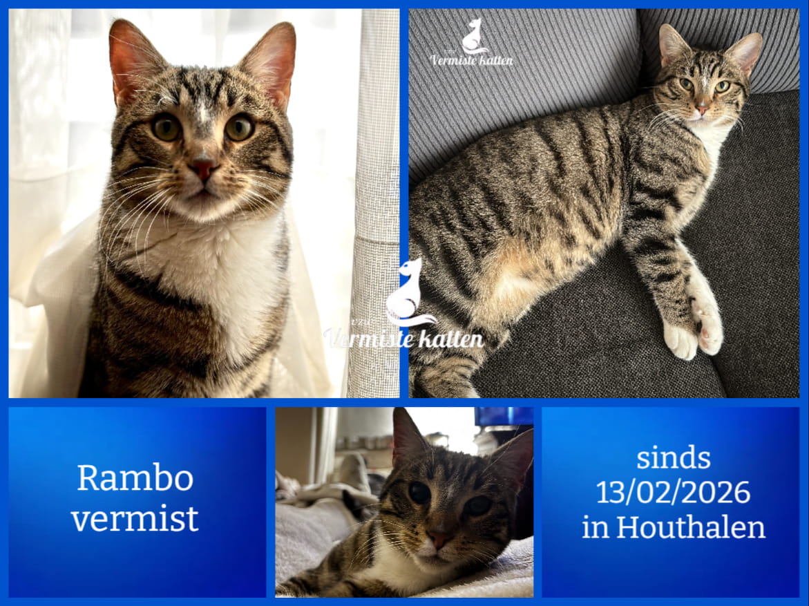 Naam kat: Rambo Datum vermist: 13/02/2026 Plaats verdwijning: Dorpsstraat Woonplaats: Houthalen Provincie: Limburg Geslacht: Kater Gesteriliseerd/Gecastreerd: Nee Geboortedatum Kat: 12/04/2025 Chip: Ja Aanvullende kenmerken: Tijger grijs met witte hals en pootjes. Witte vlek tussen...