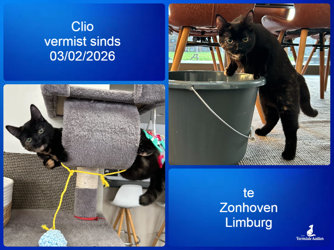 Naam kat: Clio Datum vermist: 03/02/2026 Plaats verdwijning: Gulden Boomkensweg Woonplaats: Zonhoven Provincie: Limburg Geslacht: Kattin Gesteriliseerd/Gecastreerd: Ja Geboortedatum Kat: 01/07/2025 Chip: Ja Aanvullende kenmerken: Europese kat. Kleur schildpad. Zwart met licht bruin aan...