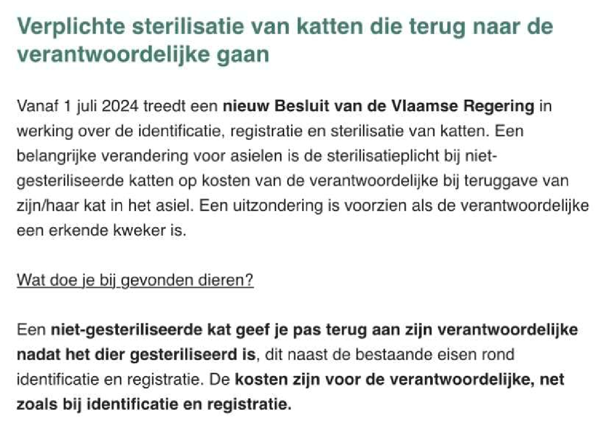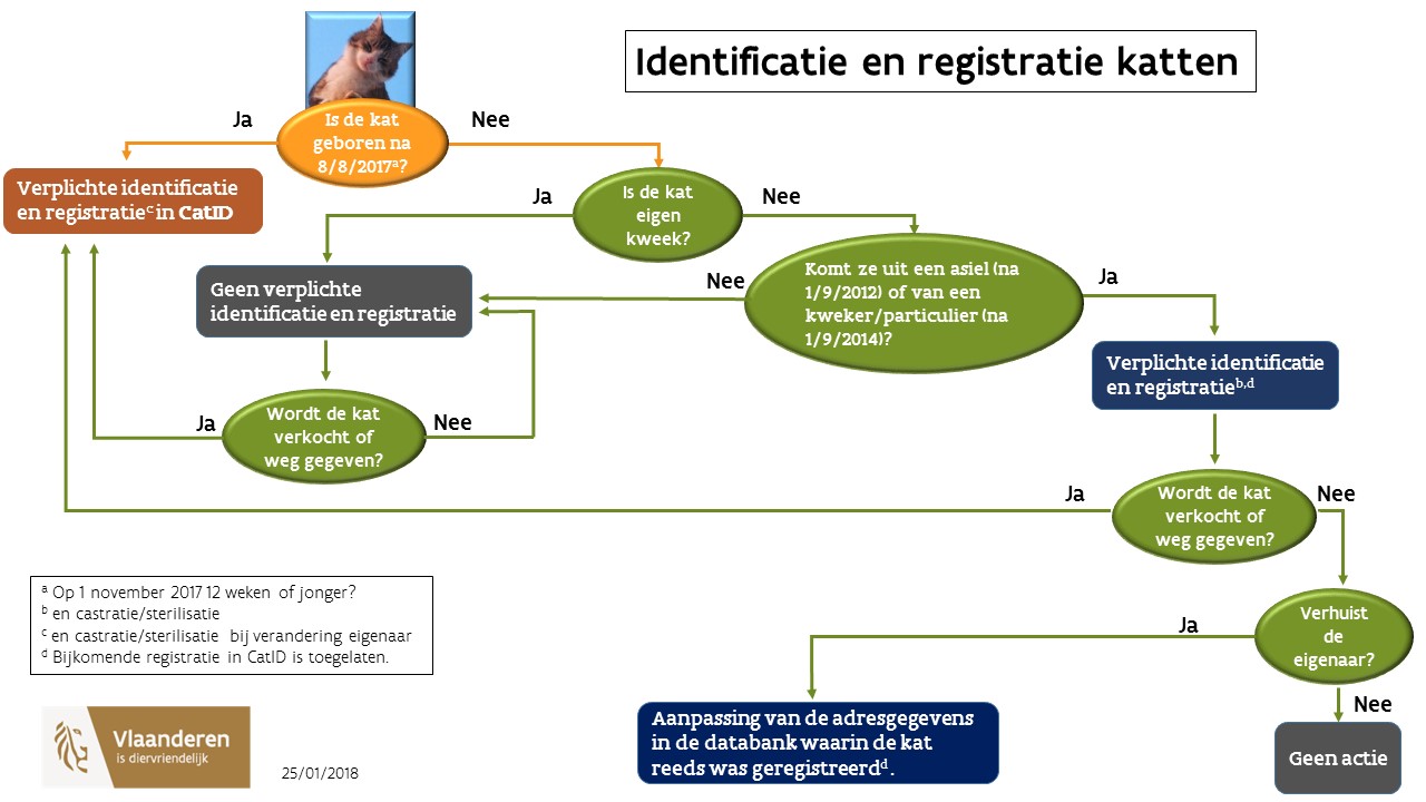 Katten geboren na 31 maart 2018 Elke kat geboren na 31 maart 2018 moet verplicht gecastreerd of gesteriliseerd zijn ten laatste op 5 maanden ouderdom of...