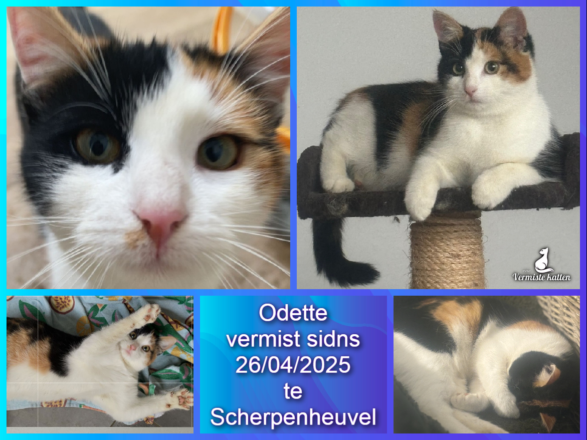 Naam kat: Odette Datum vermist: 26/04/2025 Plaats verdwijning: Heidestraat Woonplaats: Scherpenheuvel Provincie: Vlaams-Brabant Geslacht: Kattin Gesteriliseerd/Gecastreerd: Ja Geboortedatum Kat: 26/08/2023. Chip: Ja Aanvullende kenmerken: Klein lapjeskatje Mail: vermistekatten.be@gmail.com...