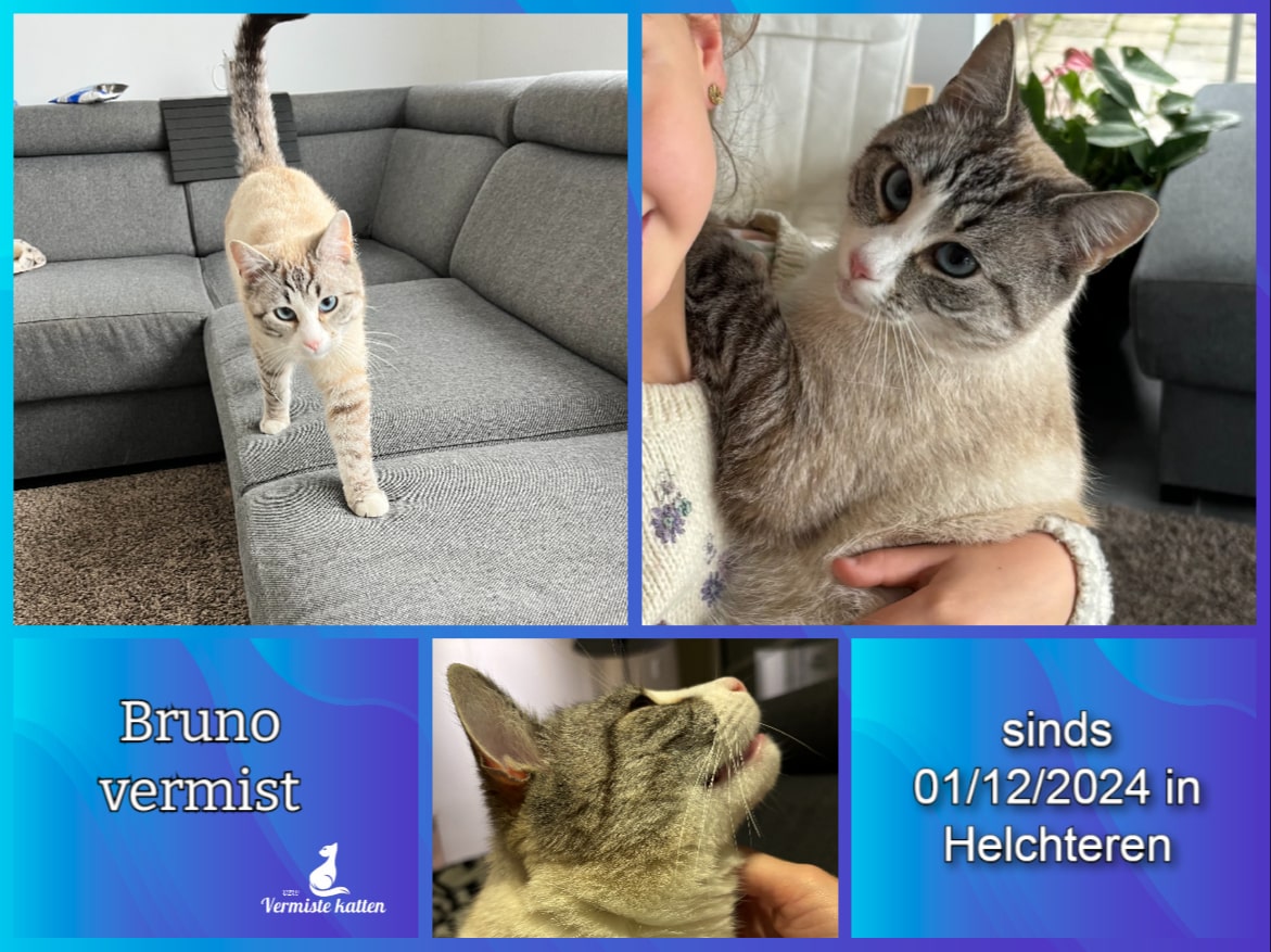 Naam kat: Bruno Datum vermist: 01/12/2024 Plaats verdwijning: Voorbroekstraat Woonplaats: Helchteren Provincie: Limburg Geslacht: Kater Gesteriliseerd/Gecastreerd: Ja Geboortedatum Kat: 25/04/2022 Chip: Ja Aanvullende kenmerken: Sociale kater met een lichte vacht, vooral zwart in de...
