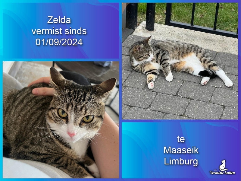 Naam kat: Zelda Datum vermist: 01/09/2024 Plaats verdwijning: Verloren Kost Woonplaats: 3680 Maaseik Provincie: Limburg Geslacht: Kattin Gesteriliseerd/Gecastreerd: Ja Geboortedatum Kat: 27/06/2023 Chip: Ja Aanvullende kenmerken: Europese raskat, Tijgerkleur met wit Mail: vermistekatten.be@gmail.com...