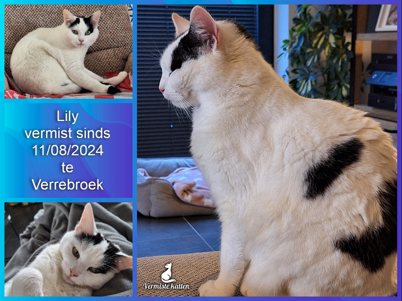 Naam kat: Lily Datum vermist: 11/08/2024 Plaats verdwijning: Rijkstraat Woonplaats: Verrebroek Provincie: Oost-Vlaanderen Geslacht: Kattin Gesteriliseerd/Gecastreerd: Ja Geboortedatum Kat: 20/08/2020 Chip: Ja Aanvullende kenmerken: Lily is een wit/zwarte kat. Vooral veel wit. Heel lief,...