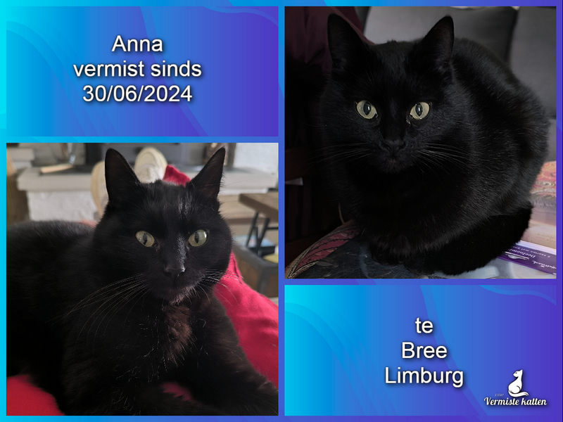 Naam kat: Anna Datum vermist: 30/06/2024 Plaats verdwijning: Bergstraat Woonplaats: Bree Provincie: Limburg Geslacht: Kattin Gesteriliseerd/Gecastreerd: Ja Geboortedatum Kat: 07/04/2020 Chip: Ja Aanvullende kenmerken: Anna is een volledig zwarte, sociale poes. Ze gaat graag...