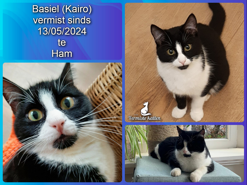 Basiel (op ID Kairo) Datum vermist: 13/05/2024 Plaats verdwijning: Grensstraat Woonplaats: 3945 Ham Provincie: Limburg Geslacht: Kater Gesteriliseerd/Gecastreerd: Ja Geboortedatum Kat: 07/06/2023 Chip: Ja Aanvullende kenmerken: asielkat - zwart wit Mail: vermistekatten.be@gmail.com...