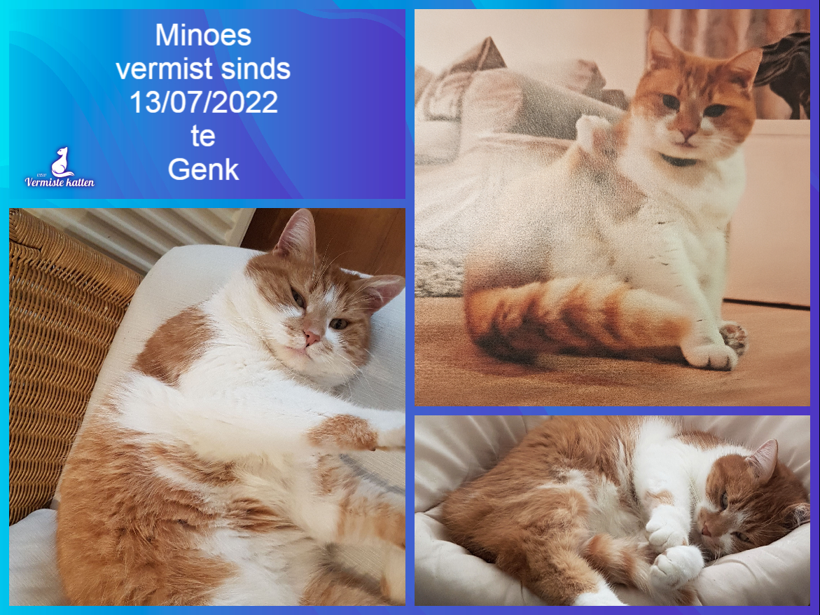 Naam kat: Minoes Datum vermist: 13/07/2022 Plaats verdwijning: Genk Woonplaats: Genk omstreken Provincie: Limburg Geslacht: Kater Gesteriliseerd/Gecastreerd: Ja Geboortedatum Kat: 01-09-2011 Chip: Ja Aanvullende kenmerken: Rosse kater. Zwart vlekje op zijn neus. 1 ros...