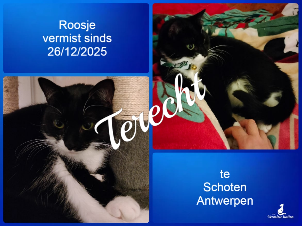 UPDATE 28/12/2025: Roosje is terug terecht! Bedankt allemaal voor de vele tips, bezorgdheid en mee te willen uitkijken. Ze zat een paar appartementen verder verstopt...