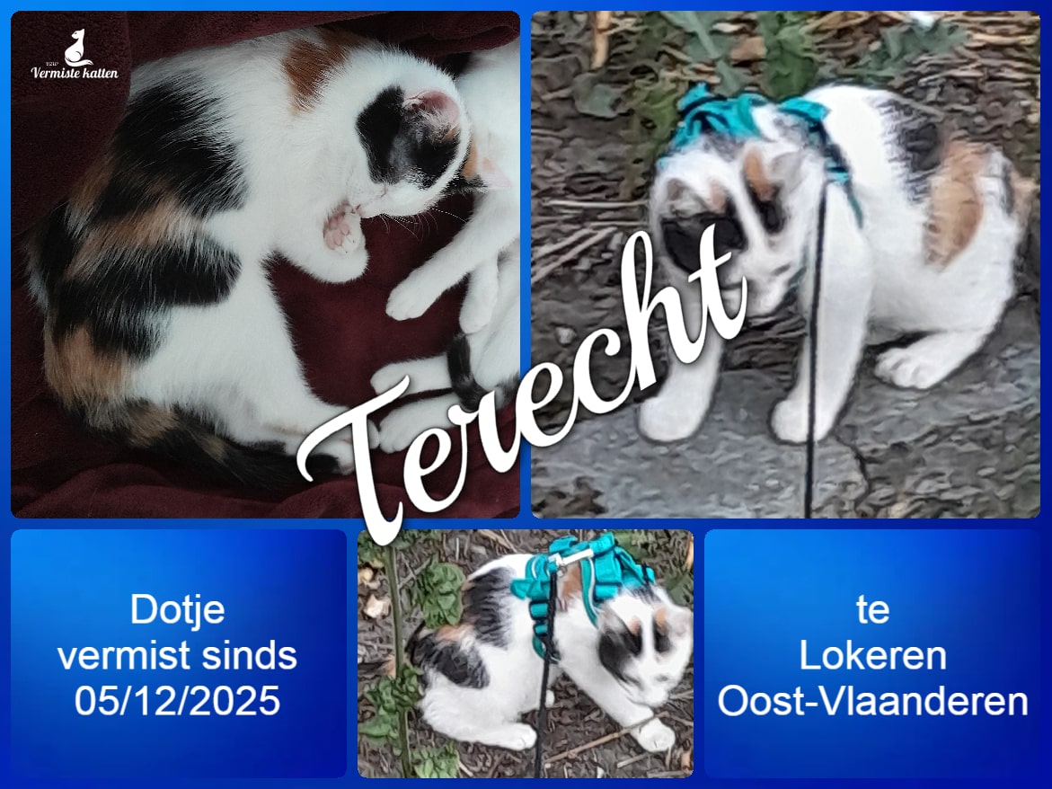UPDATE 27/12/2025 : Dotje ligt heerlijk bij mij in de zetel! Baasje en Dotje genieten terug van elkaar. Bedankt voor het meezoeken...