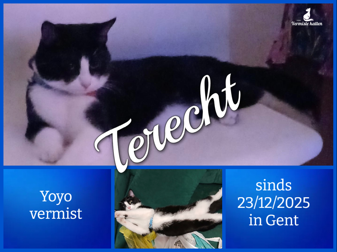 UPDATE 28/12/2025 : Yo-yo is terecht !!! Dankzij de hulp van lieve mensen waar Yo-Yo gezien werd in de tuin en die mij telefonisch contacteerde...
