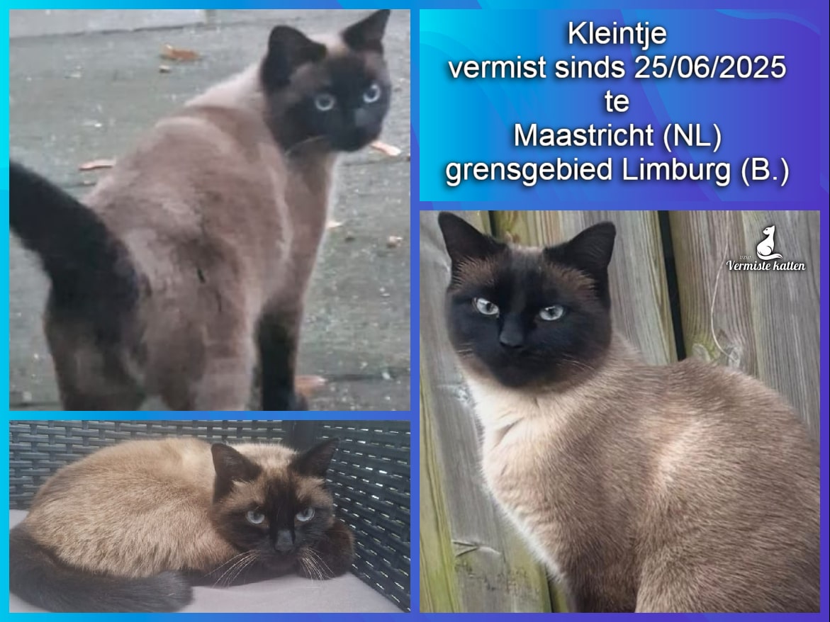 Naam kat: Kleintje Datum vermist: 25-06-2025 Plaats verdwijning: Ambachtsweg Woonplaats: Maastricht Provincie: Limburg Geslacht: Kattin Gesteriliseerd/Gecastreerd: Ja Geboortedatum Kat: 28-04-2022 Chip: Ja Aanvullende kenmerken: Donker kop, staart en poten, beige/lichtbruin lichaam. Blauwe ogen. Draagt...