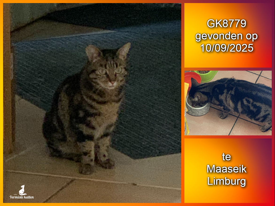 Datum gevonden: 10 /9/2025 Straat: Venlosesteenweg Gemeente: Maaseik Provincie: Limburg Geslacht: Geen idee Aanvullende kenmerken: Gestreepte bruin zwarte kat , zeer tam maakt kortere geluidjes, komt binnen , maakt zich...