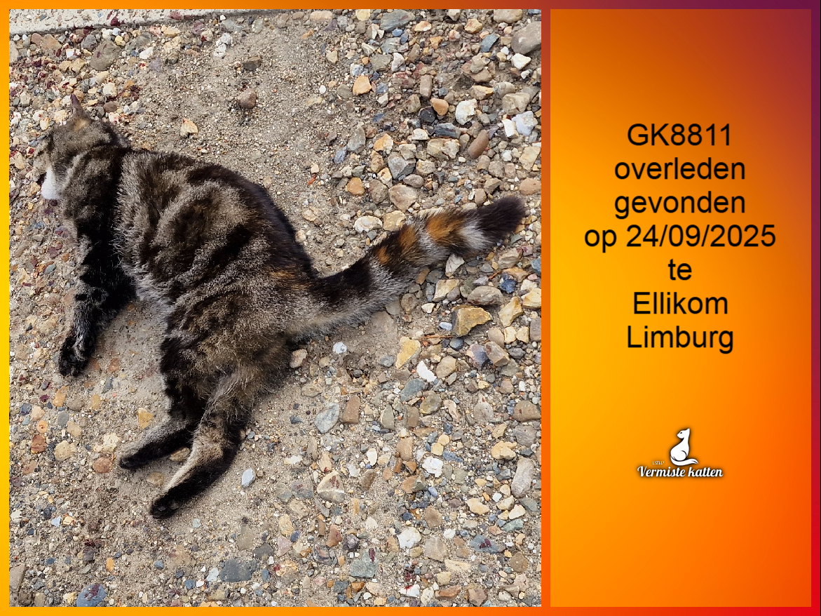 Datum gevonden: 24/09/2025 Straat: Schutterslaan Gemeente: Ellikom Provincie: Limburg Geslacht: Geen idee Aanvullende kenmerken: Helaas een overleden cypers katje langs de weg gevonden, vlak voor Ellimetal in Ellikom. Waarschijnlijk gisteren...