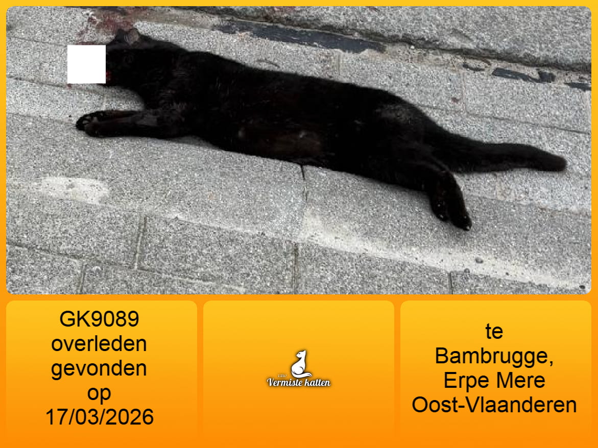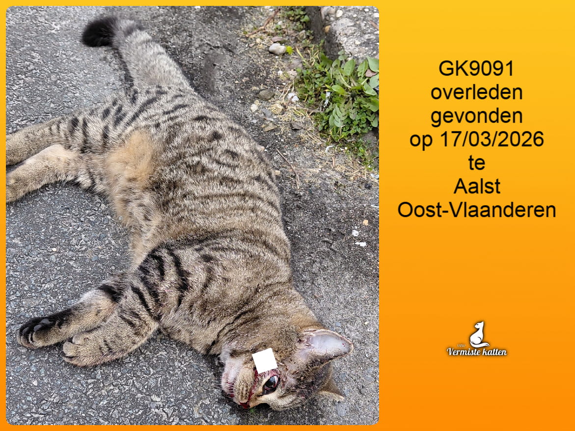 Datum gevonden: 17/03/2026 Straat: op de hoek van Arendsveld en Gefusilleerdenstraat Gemeente: Aalst Provincie: Oost-Vlaanderen Geslacht: Kattin Aanvullende kenmerken: Overleden katje. Ze lag op de hoek van Arendsveld en Gefusilleerdenstraat,...