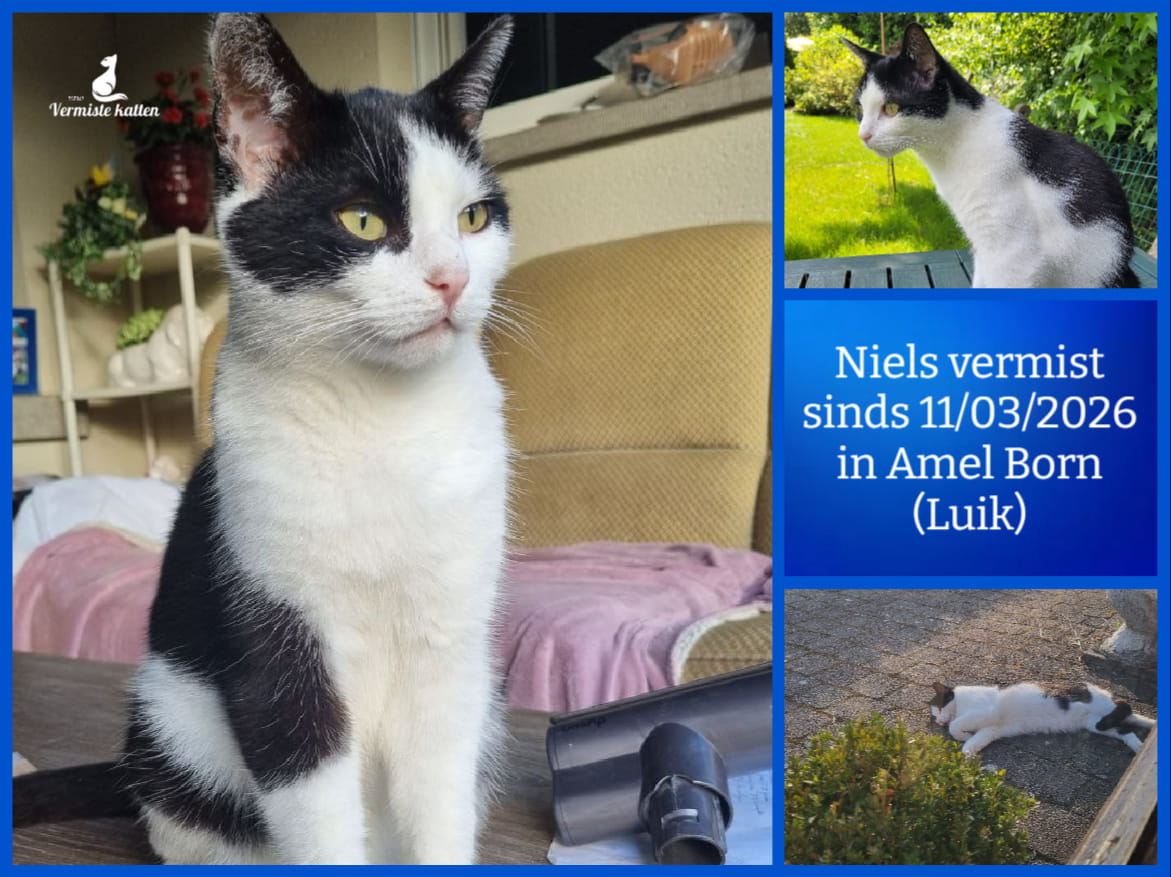 Naam kat: Niels Datum vermist: 11/03/2026 Plaats verdwijning: Rechter Strasse Woonplaats: Amel Born Provincie: Luik Geslacht: Kater Gesteriliseerd/Gecastreerd: Ja Geboortedatum Kat: 16/05/2017 Chip: Ja Aanvullende kenmerken: korthaar zwart wit. Wit plekje dorsaal Mail: vermistekatten.be@gmail.com...