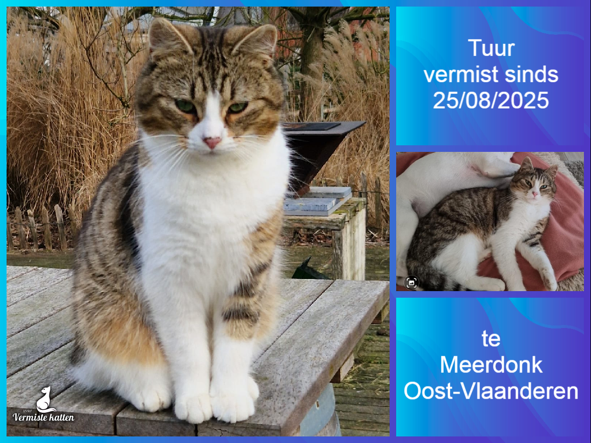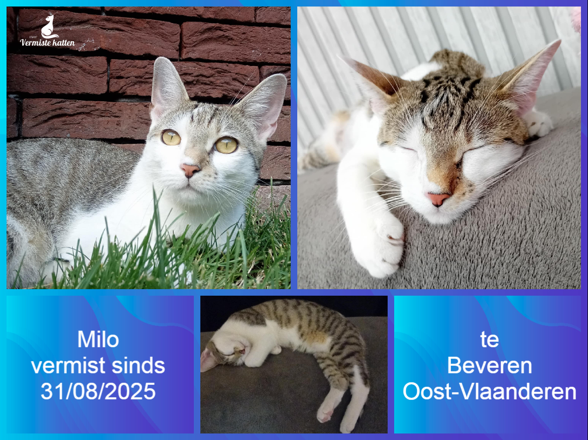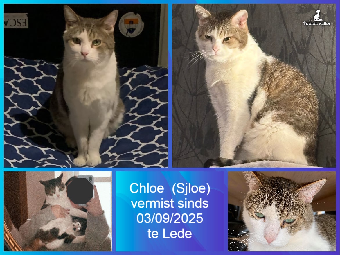 Naam kat: Chloe (spreek je uit als ‘sjloe’) Datum vermist: 03-09-2025 Plaats verdwijning: Keibergkerkweg Woonplaats: Lede Provincie: Oost-Vlaanderen Geslacht: Kater Gesteriliseerd/Gecastreerd: Ja Geboortedatum Kat: 19/05/2017 Chip: Nee Aanvullende kenmerken: Hij is een witte grijze...