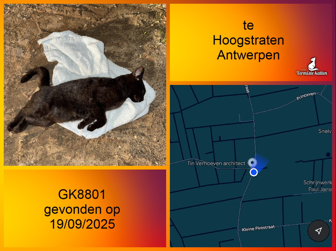 Datum gevonden: 19/09/2025 Straat: Hinneboomstraat Gemeente: Hoogstraten Provincie: Antwerpen Geslacht: Kattin Aanvullende kenmerken: Gisteren avond rond 20:45 een zwarte  aangereden poesje gevonden in de Hinneboomstraat. We zijn vandaag langs de...