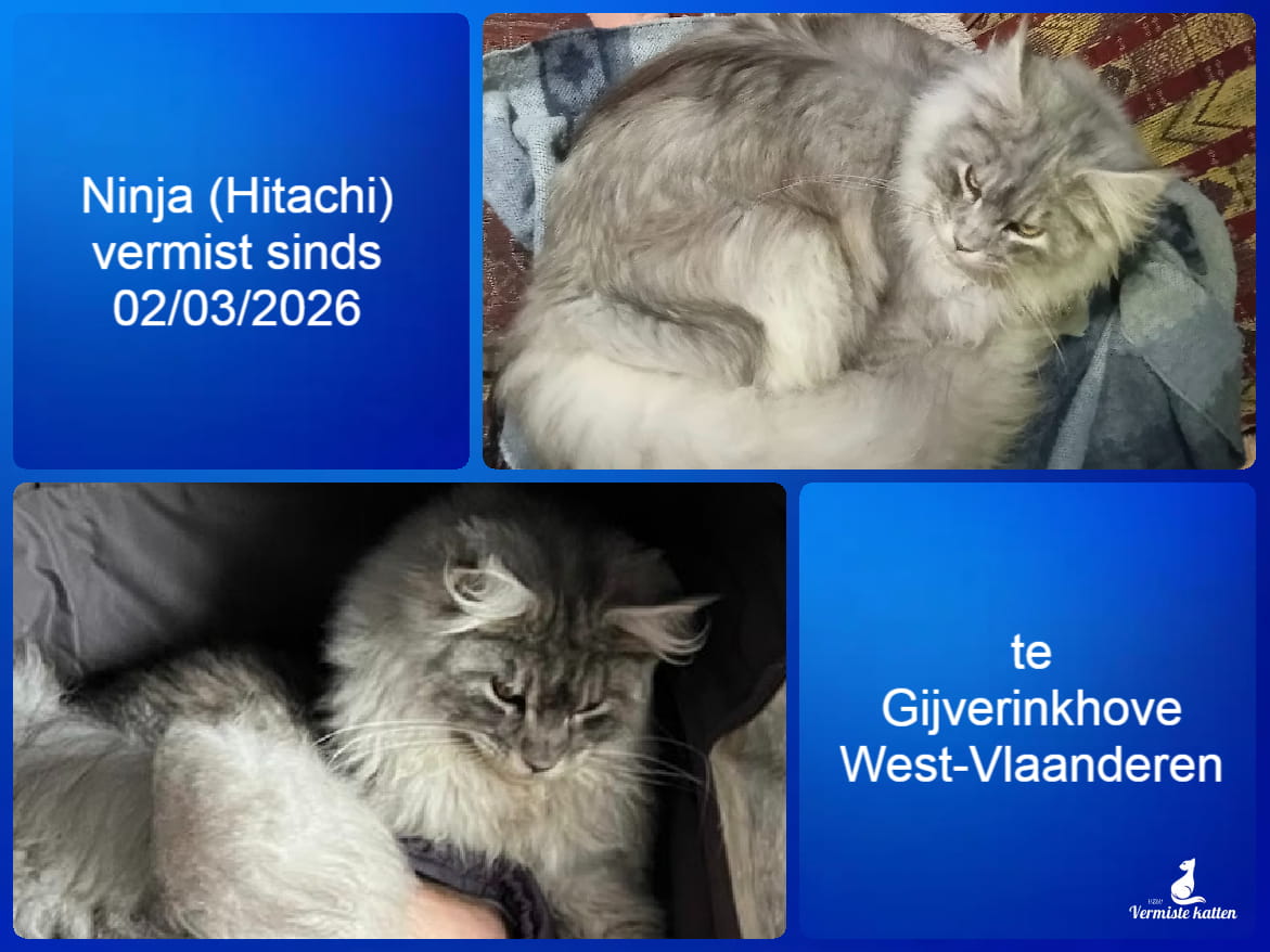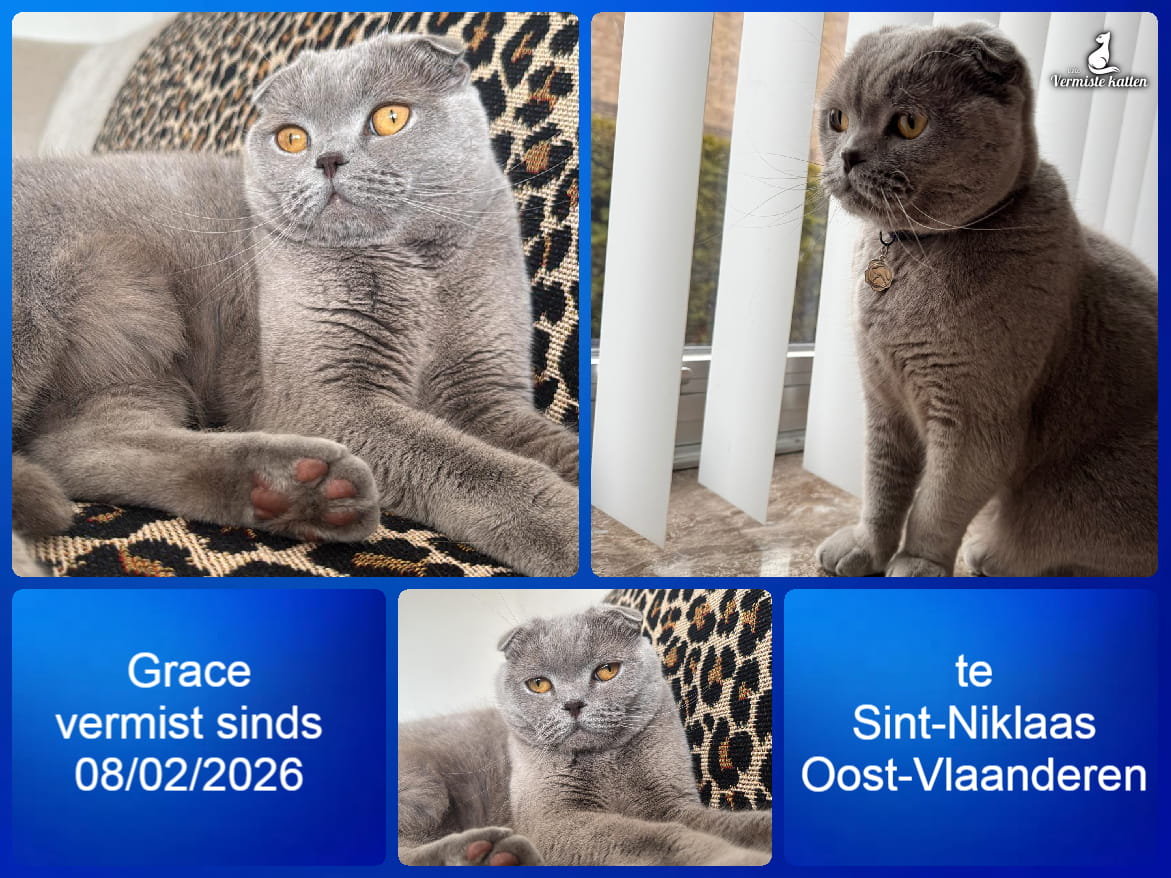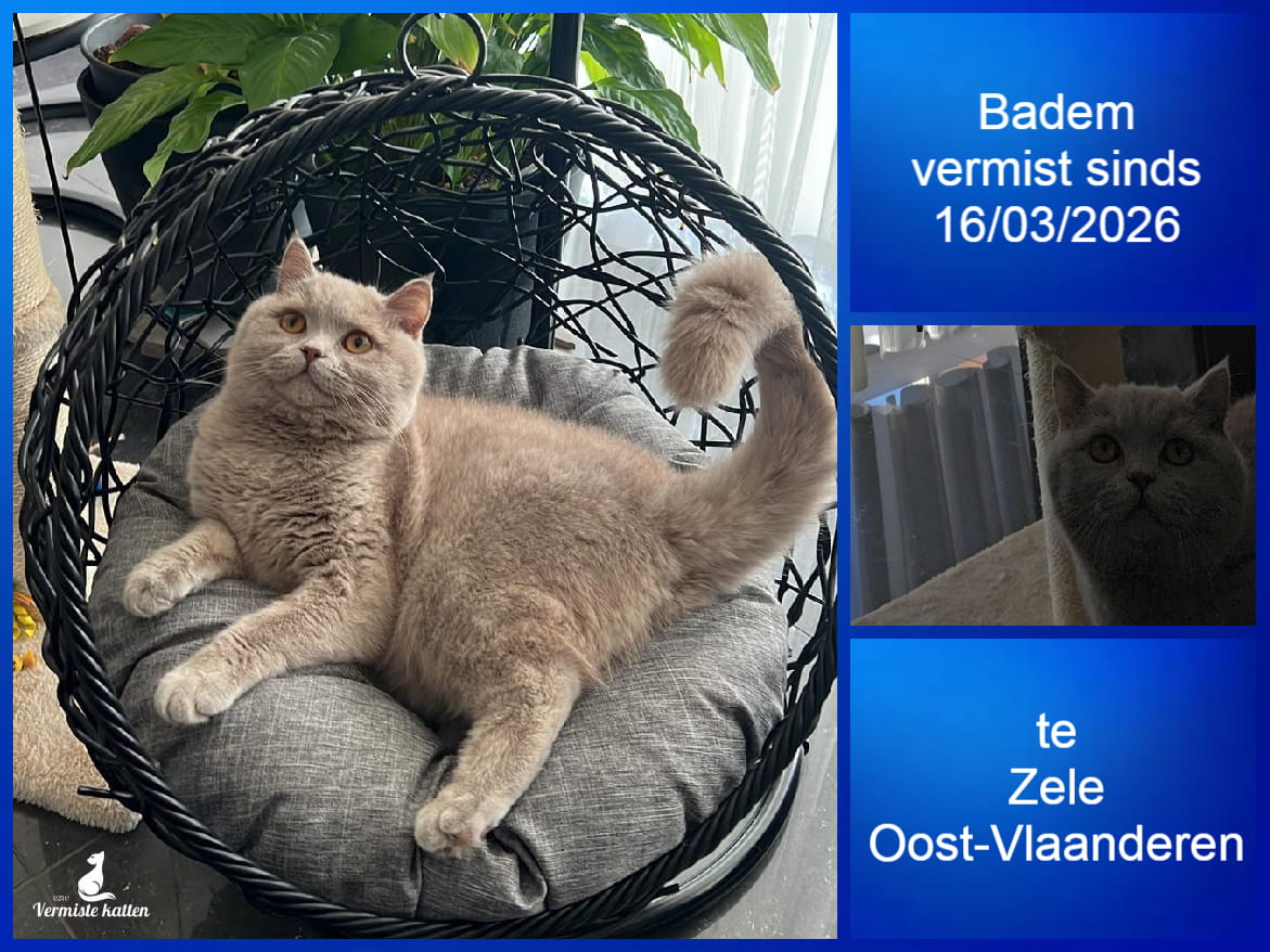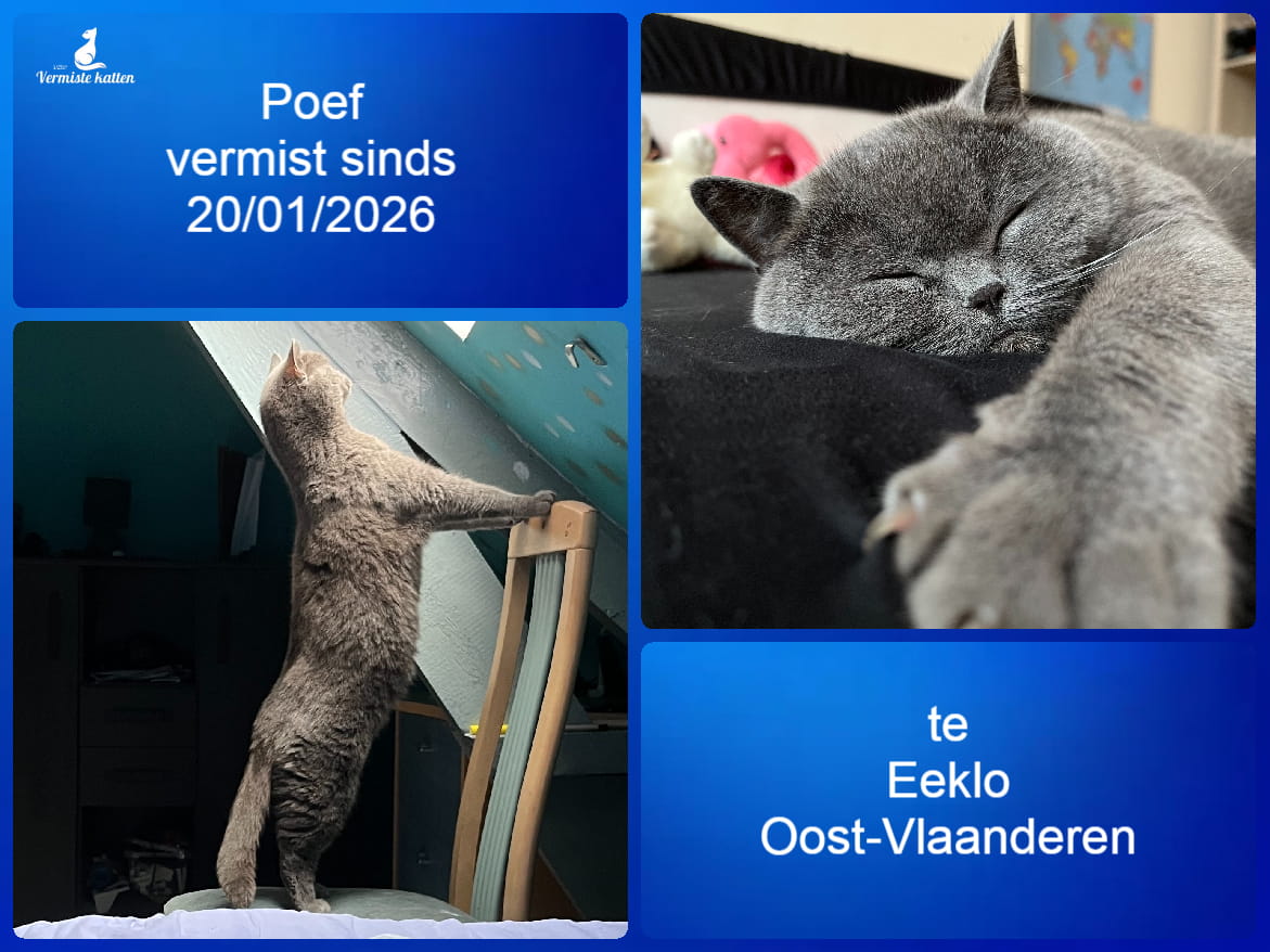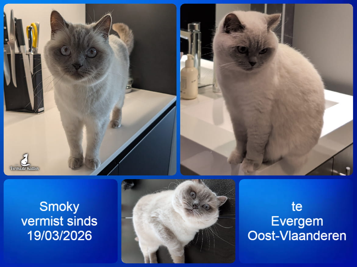 Naam kat: SMOKY Datum vermist: 19/03/2026 Plaats verdwijning: ELSLO Woonplaats: EVERGEM Provincie: Oost-Vlaanderen Geslacht: Kattin Gesteriliseerd/Gecastreerd: Ja Geboortedatum Kat: 13/07/2017 Chip: Ja Aanvullende kenmerken: Britse korthaar, blue point (wit, grijs gezicht). 9 jaar oud....