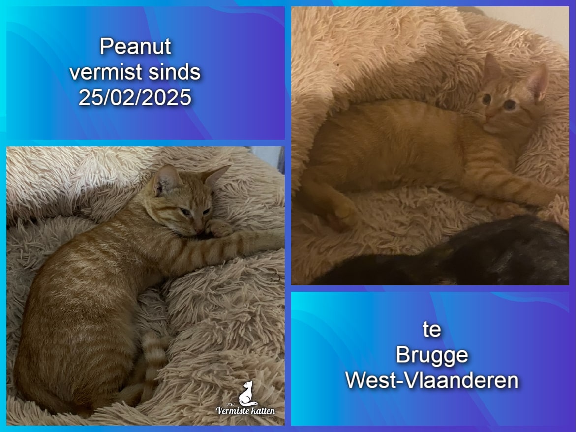 Naam kat: Peanut Datum vermist: 25/2/2025 Plaats verdwijning: Cesar Gezellestraat Woonplaats: 8310 Brugge Provincie: West-Vlaanderen Geslacht: Kater Gesteriliseerd/Gecastreerd: Ja Geboortedatum Kat: 20/05/24 Chip: Ja Aanvullende kenmerken: Kater, rost Mail: vermistekatten.be@gmail.com...