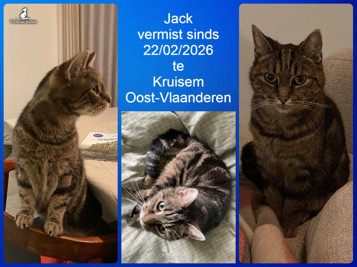 Naam kat: Jack Datum vermist: 22/02/2026 Plaats verdwijning: Nazarethsesteenweg Woonplaats: Kruisem Provincie: Oost-Vlaanderen Geslacht: Kater Gesteriliseerd/Gecastreerd: Ja Geboortedatum Kat: 1/12/2013 Chip: Ja Aanvullende kenmerken: Bruin/zwart Mail: vermistekatten.be@gmail.com...