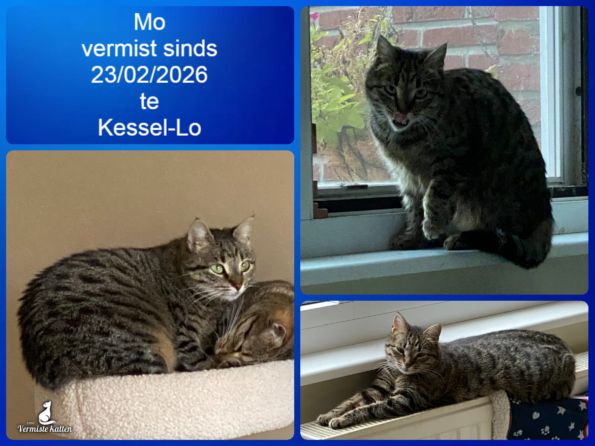 Naam kat: Mo Datum vermist: 23/02/2026 Plaats verdwijning: Toekomststraat Woonplaats: 3010 Kessel-Lo Provincie: Vlaams-Brabant Geslacht: Kattin Gesteriliseerd/Gecastreerd: Ja Geboortedatum Kat: 10/06/2022 Chip: Ja Aanvullende kenmerken: Tijger, korte staart. Mensenschuw! Mail: vermistekatten.be@gmail.com...