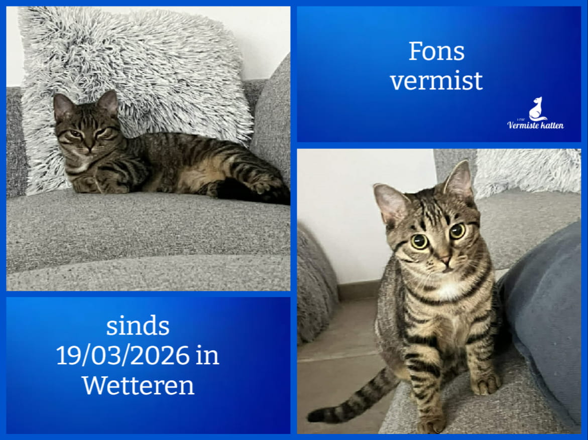 Naam kat: Fons Datum vermist: 19/03/2026 Plaats verdwijning: Schrijakkerstraat Woonplaats: Wetteren Provincie: Oost-Vlaanderen Geslacht: Kater Gesteriliseerd/Gecastreerd: Ja Geboortedatum Kat: 10 maanden Chip: Ja Aanvullende kenmerken: Tijger met klein beetje wit op de borst. Heel...