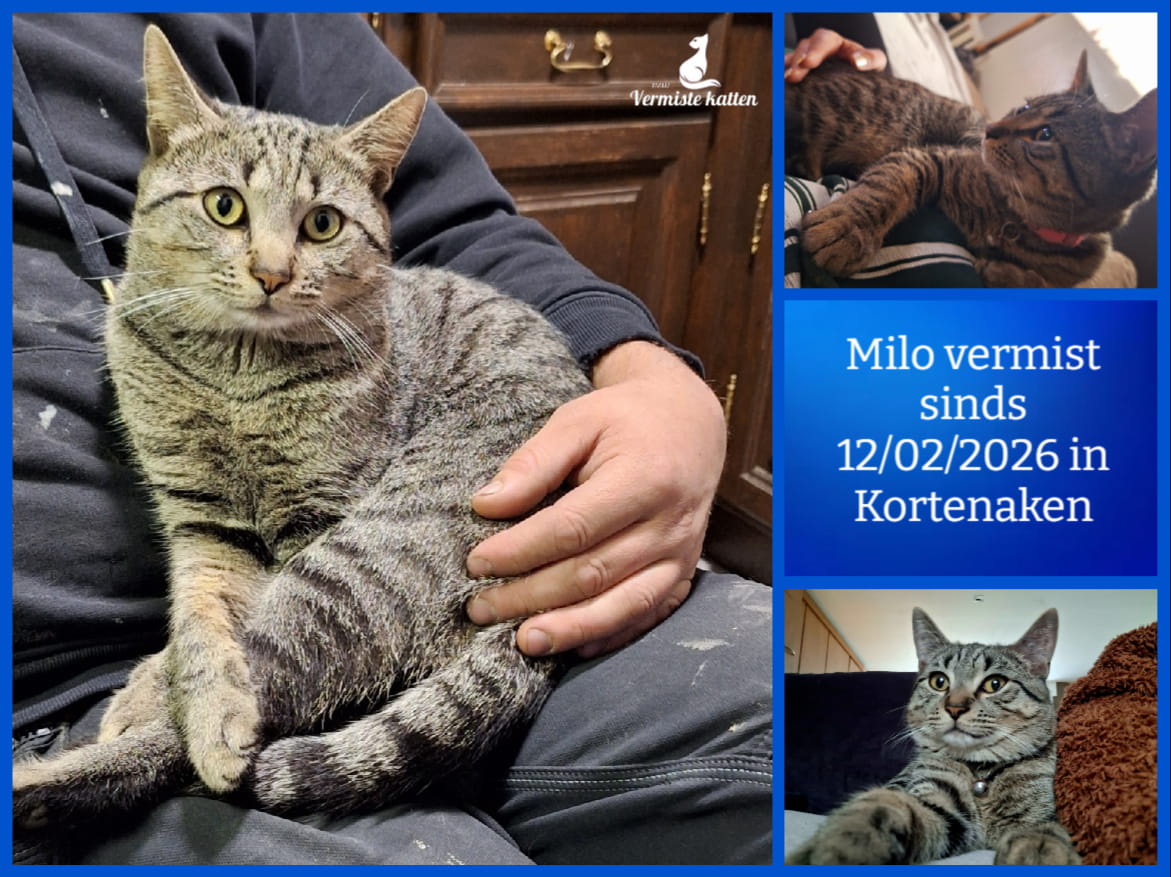 Naam kat: Milo Datum vermist: 12/02/2026 Plaats verdwijning: Diestsestraat Woonplaats: Kortenaken Provincie: Vlaams-Brabant Geslacht: Kater Gesteriliseerd/Gecastreerd: Nee Geboortedatum Kat: 22/05/2024 Chip: Nee Aanvullende kenmerken: Milo is een tijger, hij is heel speels en vraagt...