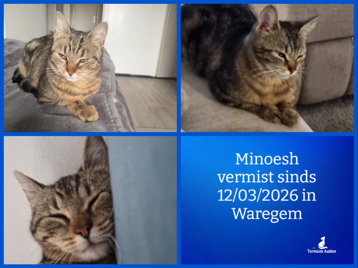 Naam kat: Minoesh Datum vermist: 12/03/2026 Plaats verdwijning: Hogekouter Woonplaats: Waregem Provincie: West-Vlaanderen Geslacht: Kattin Gesteriliseerd/Gecastreerd: Nee Geboortedatum Kat: 02/12/2022 Chip: Nee Aanvullende kenmerken: Tijger zonder halsbandje, klein, loopt wat scheef Mail: vermistekatten.be@gmail.com...