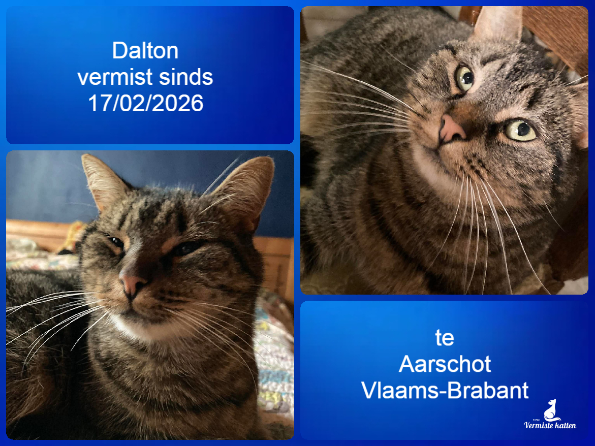 Naam kat: Dalton Datum vermist: 17/2/2026 Plaats verdwijning: Gijmelstraat Woonplaats: Aarschot Provincie: Vlaams-Brabant Geslacht: Kater Gesteriliseerd/Gecastreerd: Ja Geboortedatum Kat: 23/7/2017 Chip: Ja Aanvullende kenmerken: Grijze tijgerkat Mail: vermistekatten.be@gmail.com...