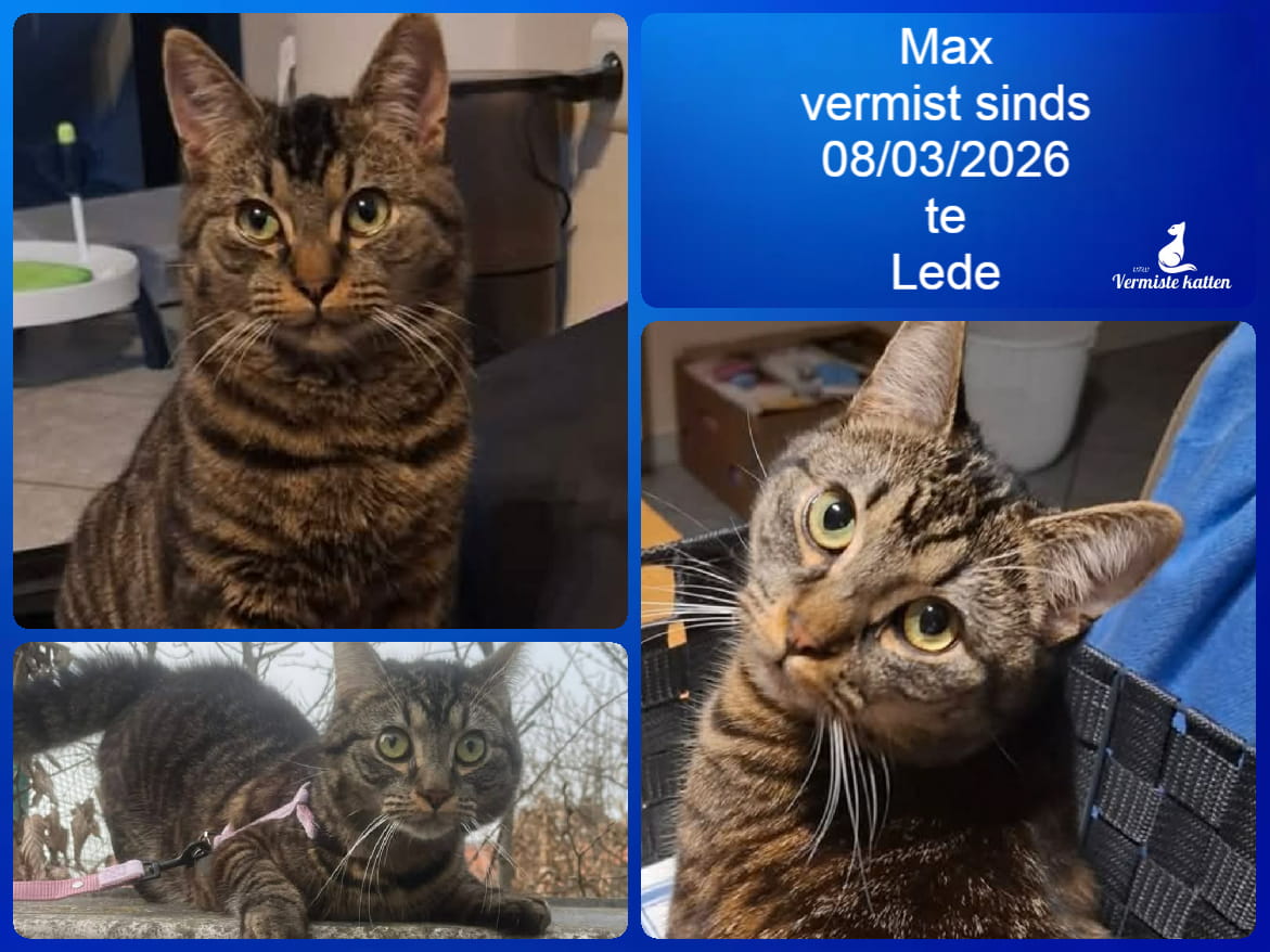 Naam kat: Max Datum vermist: 08/03/2026 Plaats verdwijning: Station Lede Woonplaats: Lede Provincie: Oost-Vlaanderen Geslacht: Kater Gesteriliseerd/Gecastreerd: Ja Geboortedatum Kat: 15/05/2025 Chip: Ja Aanvullende kenmerken: Grijs getijgerde kater van 10 maand. Heel schuchter. Klein...