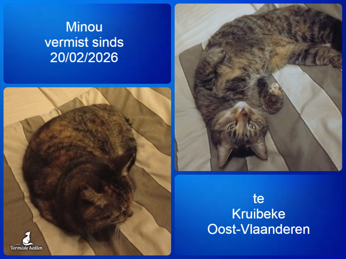 Naam kat: Minou Datum vermist: 20/02/2026 Plaats verdwijning: Hendrik Mertensstraat Woonplaats: Kruibeke Provincie: Oost-Vlaanderen Geslacht: Kattin Gesteriliseerd/Gecastreerd: Ja Geboortedatum Kat: 29/04/2016 Chip: Ja Aanvullende kenmerken: Grijs tijgerkatje Mail: vermistekatten.be@gmail.com...