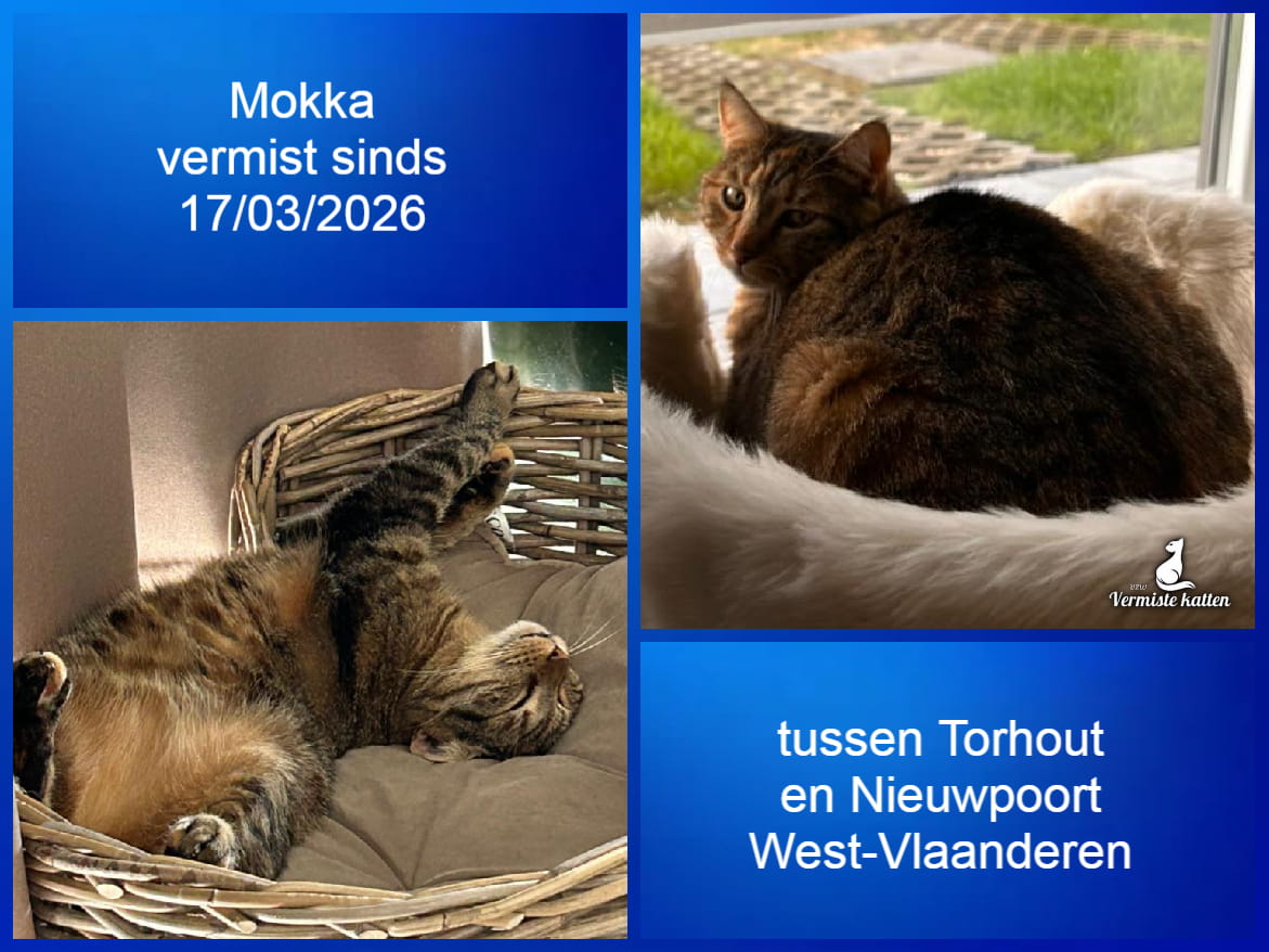 Naam kat: Mokka Datum vermist: 17/03/2026 Plaats verdwijning: Kinderlaan Nieuwpoort of Bruggestraat Torhout Woonplaats: Torhout of Nieuwpoort Provincie: West-Vlaanderen Geslacht: Kattin Gesteriliseerd/Gecastreerd: Ja Geboortedatum Kat: 03/06/2017 Chip: Ja Aanvullende kenmerken: Tijgerpoes (bruin, beige, donkerbruin),...