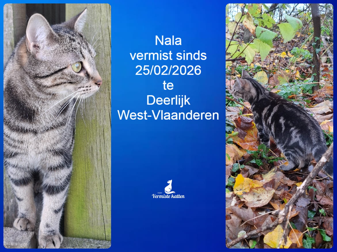 Naam kat: Nala Datum vermist: 25/2/2026 Plaats verdwijning: Boudewijnlaan Woonplaats: Deerlijk Provincie: West-Vlaanderen Geslacht: Kattin Gesteriliseerd/Gecastreerd: Ja Geboortedatum Kat: 16/4/2025 Chip: Ja Aanvullende kenmerken: Tijger kleur, geen witte voetjes, vrij klein, enorm vocaal en...