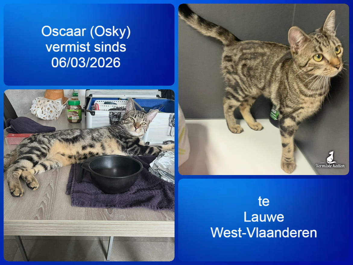 Naam kat: Oscaar/ Osky luistert naar beide namen Datum vermist: 06/03/2026 Plaats verdwijning: Larstraat Woonplaats: Lauwe Provincie: West-Vlaanderen Geslacht: Kater Gesteriliseerd/Gecastreerd: Ja Geboortedatum Kat: 10/09/2025 Chip: Ja Aanvullende kenmerken: Tijgerkat met een m op...