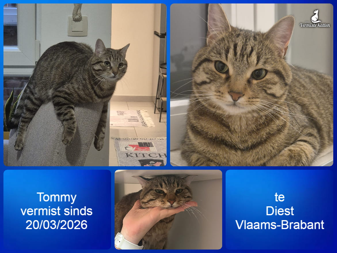 Naam kat: Tommy Datum vermist: 20/03/2026 Plaats verdwijning: Emile Vanderveldestraat Woonplaats: 3290 Diest Provincie: Vlaams-Brabant Geslacht: Kater Gesteriliseerd/Gecastreerd: Ja Geboortedatum Kat: 02/12/2023 Chip: Ja Aanvullende kenmerken: Hij is een cyperse kat. Hij heeft een...