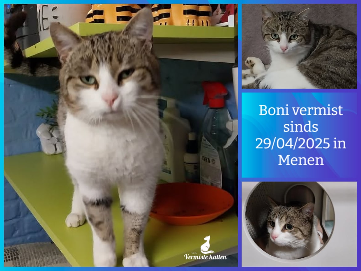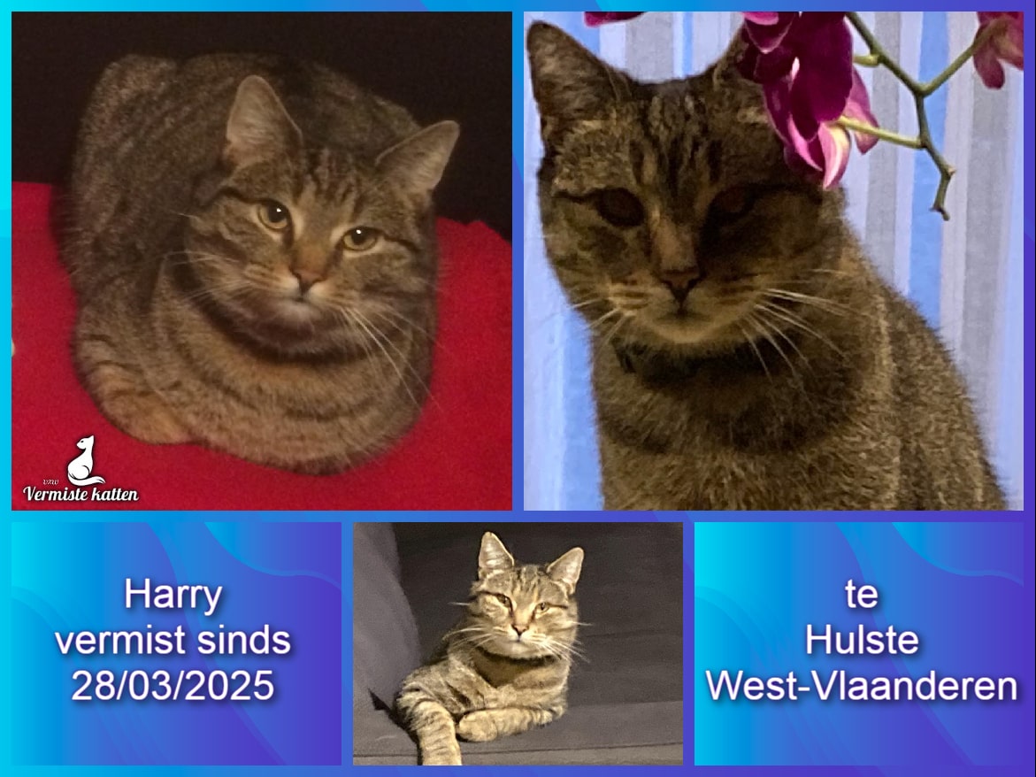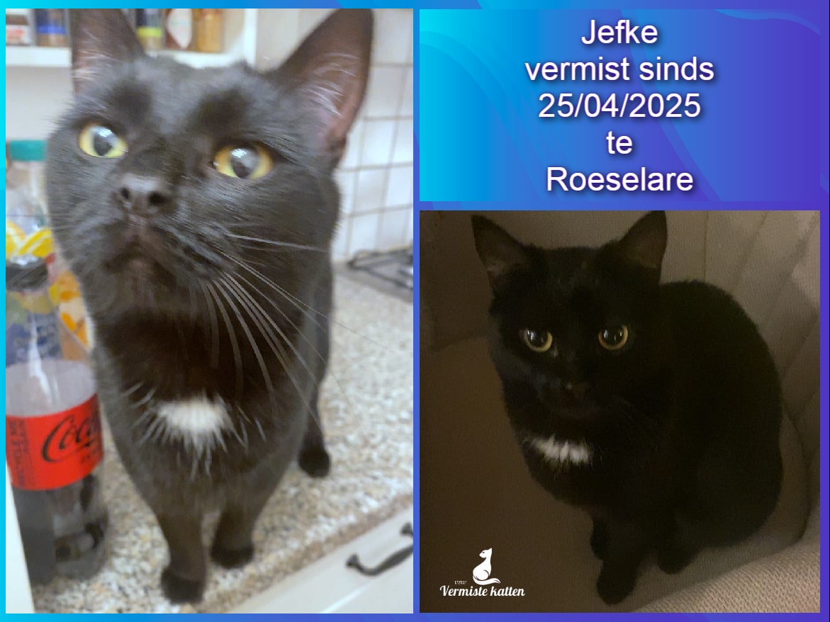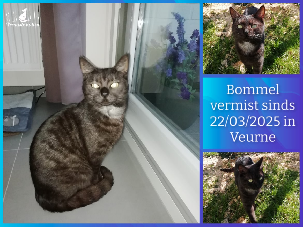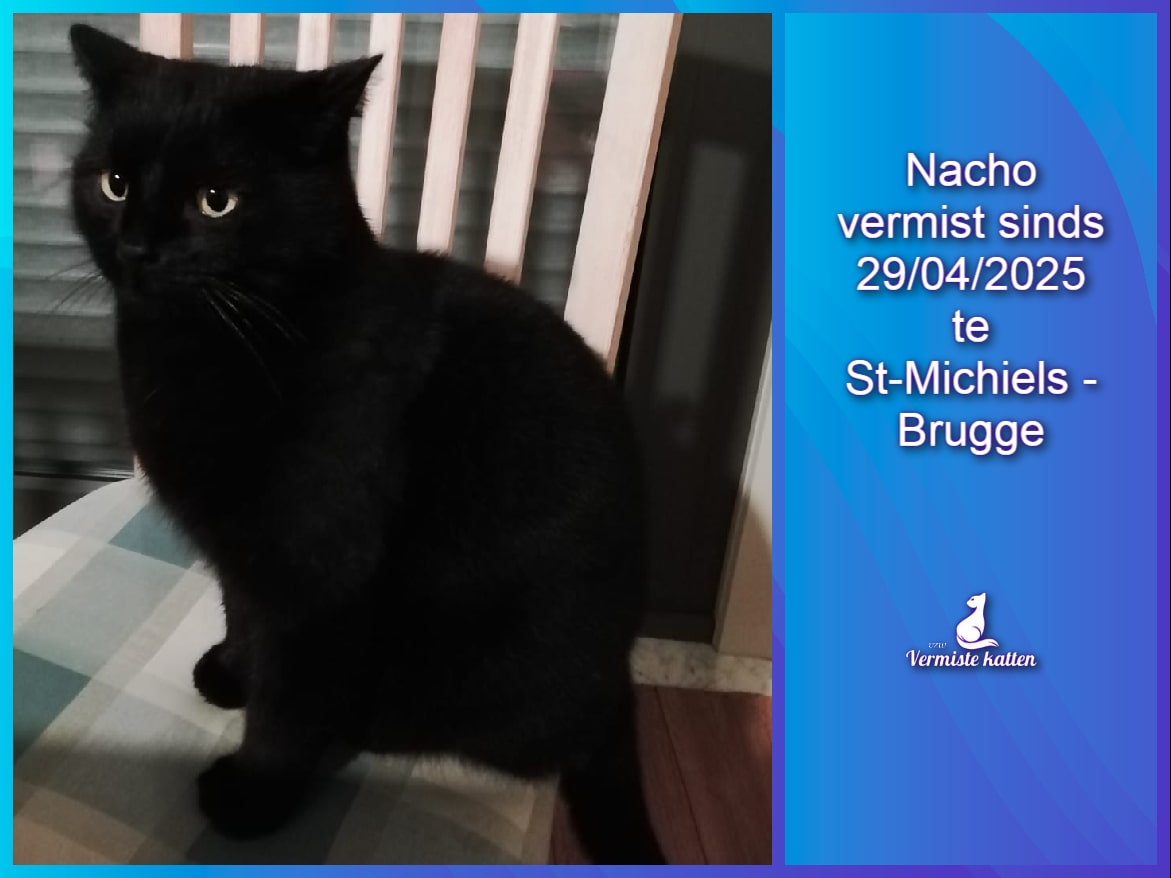 Naam kat: NACHO Datum vermist: 29/04/2025 Plaats verdwijning: Ter Beke, Woonplaats: St-Michiels Brugge Provincie: West-Vlaanderen Geslacht: Kater Gesteriliseerd/Gecastreerd: Ja Geboortedatum Kat: 9 jaar oud Chip: Ja Aanvullende kenmerken: Volledig zwarte kater Mail: vermistekatten.be@gmail.com...